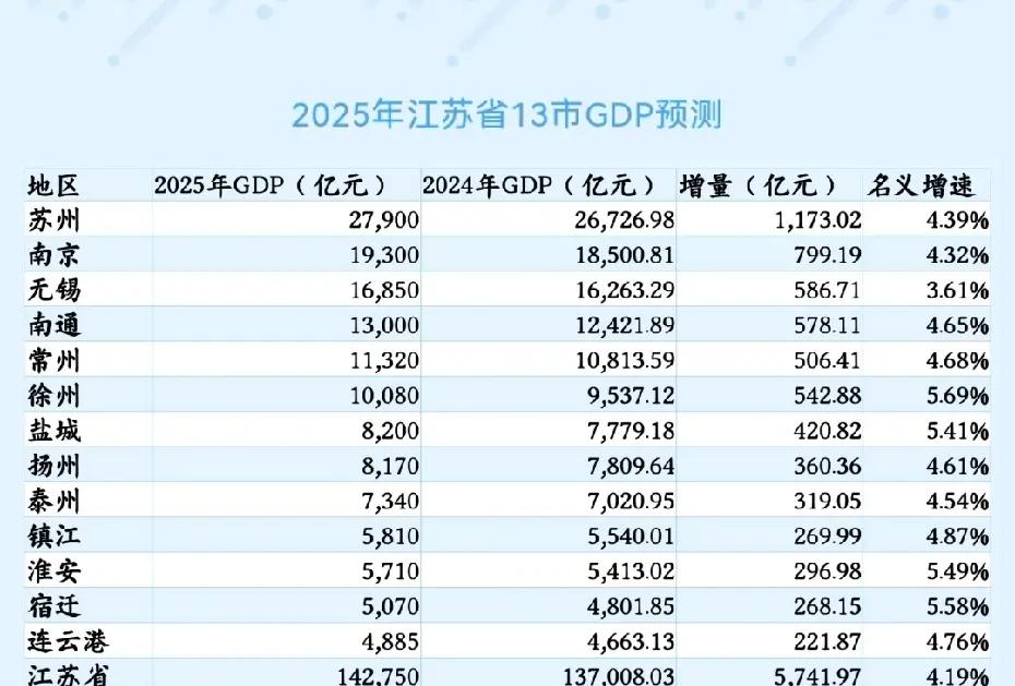 江苏各市2025年GDP预测出炉:徐州破万亿、盐城超扬州、宿迁破五千亿 江苏是我国经济第二大省,2025年全省GDP预测实现142750亿,较去年同期增加了5741.97亿,名义增长4.19%,江苏各市2025年GDP预测数据也都出炉了,其中徐州成为全省第五座GDP万亿城市,2025年GDP预测实现10080亿,较去年同期增加了542.88亿,位居全省第五名。 盐城和扬州2025年GDP总量相当,分别实现8200亿和8170亿,较去年同期分别增加了420.82亿和360.36亿,扬州经济增量低于盐城,导致经济总量被盐城反超30亿。 宿迁2025年GDP总量成功突破五千亿大关,预测实现5070亿,较去年同期增加了268.15亿,宿迁自从经济总量反超连云港后,对连云港的经济领先优势逐年在增加。