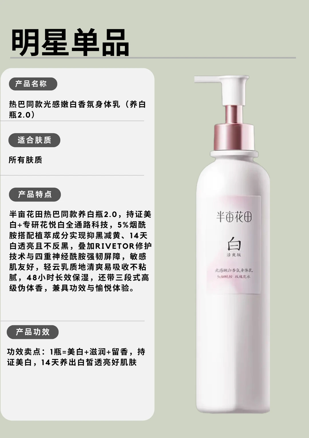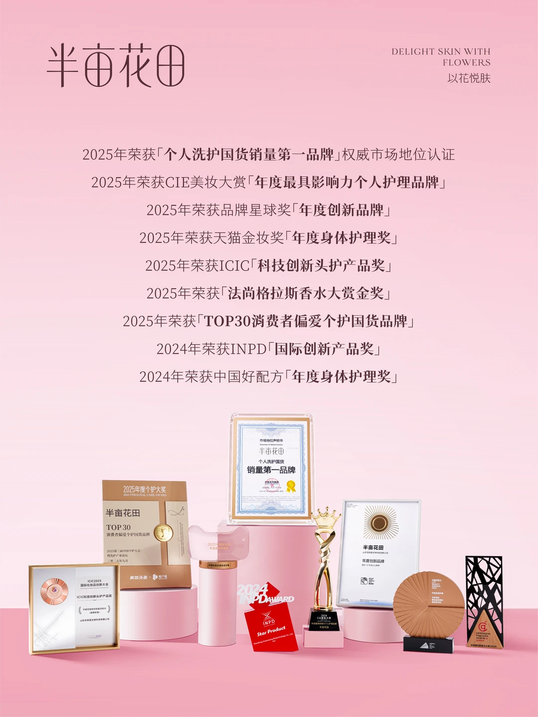 2024年底半亩花田官宣迪丽热巴升级成全球品牌代言人(身体洗护系列),进一步诠释半亩花田品牌理念“以花悦肤”。现在美妆个护圈都在找顶流合作,半亩花田这步棋,既是对标竞品,更是想靠着“东方花植护肤”冲击全球市场。