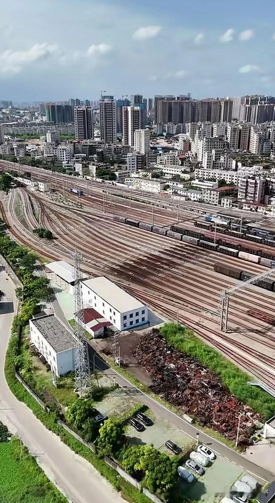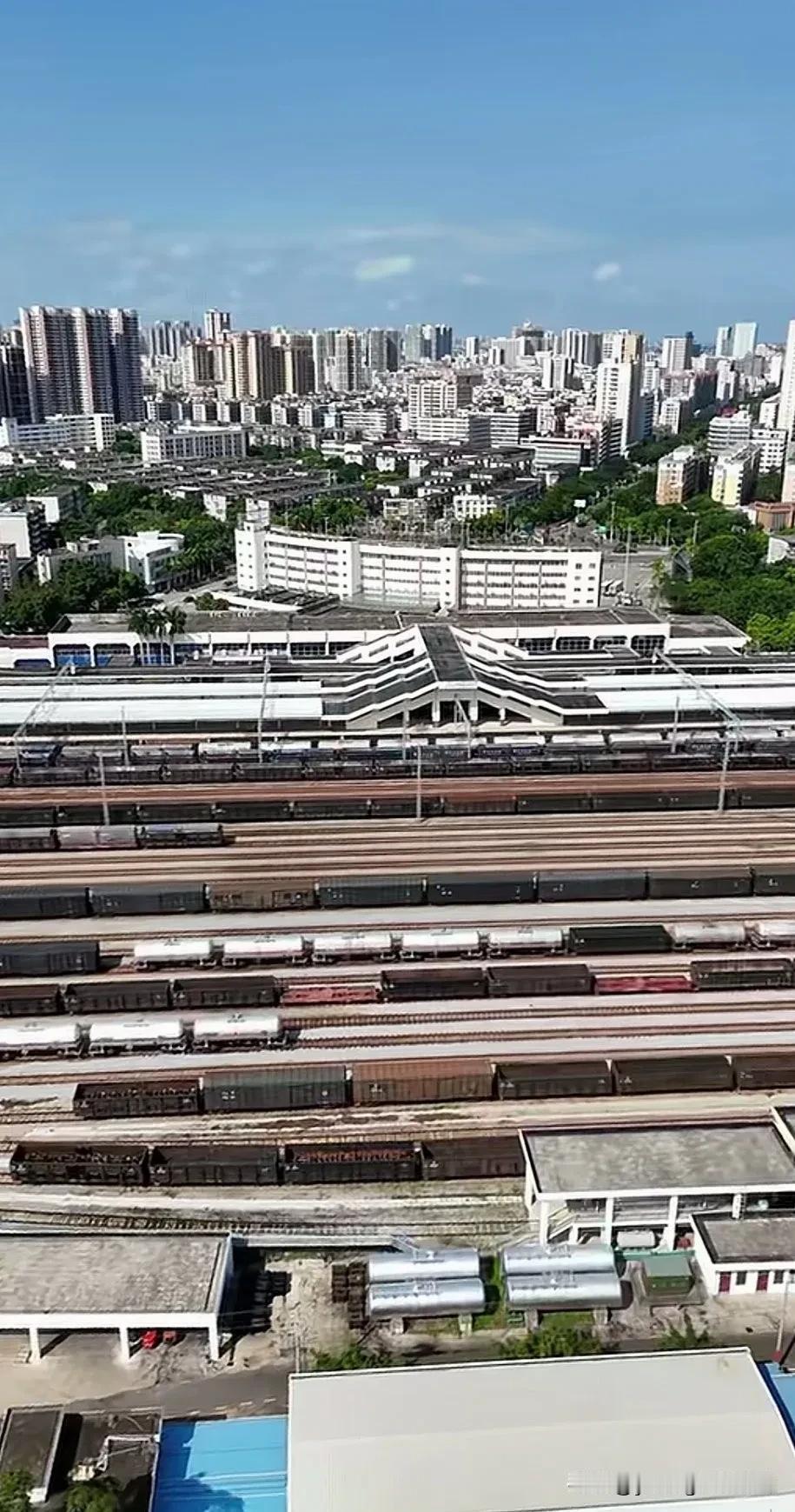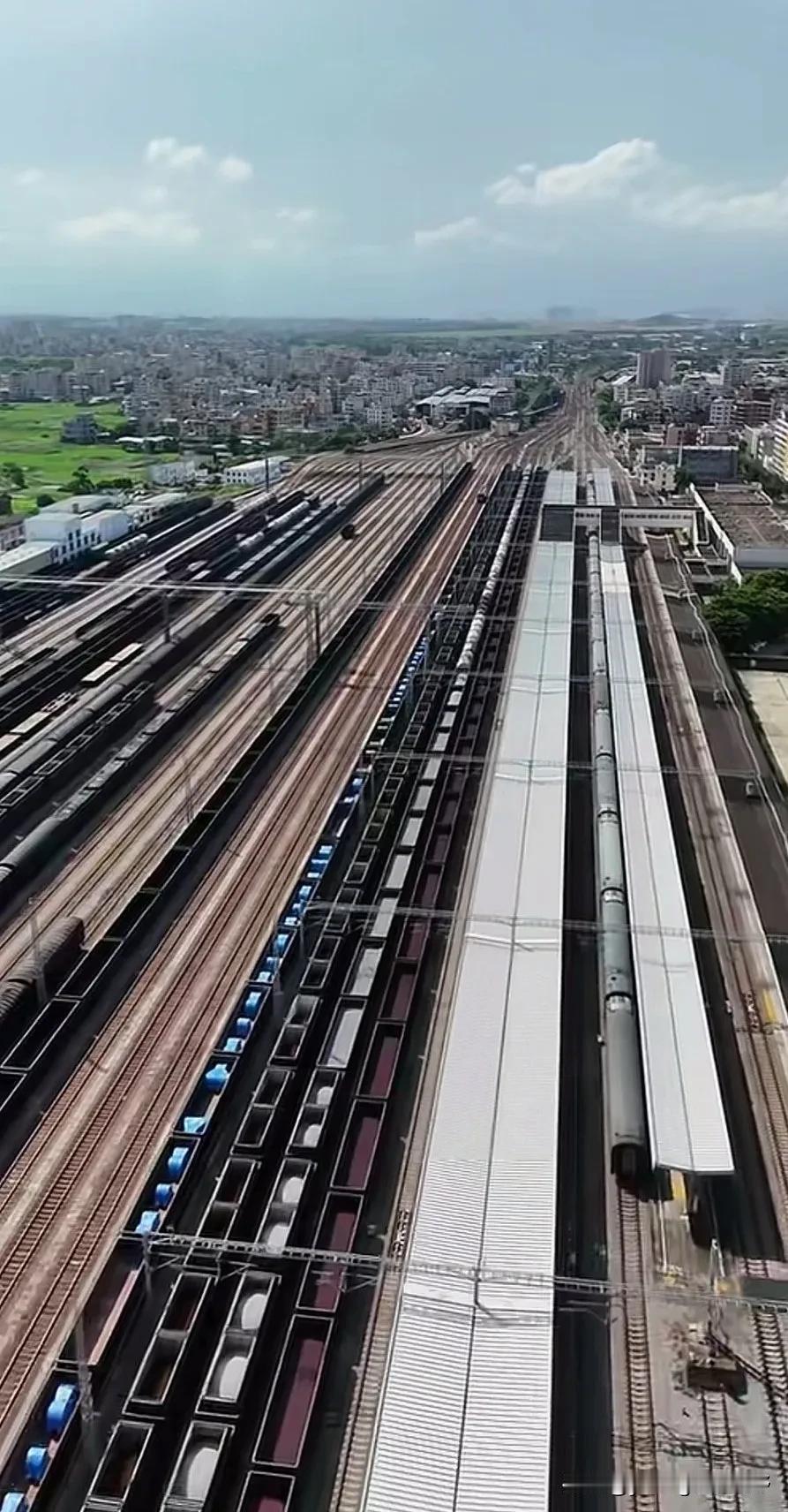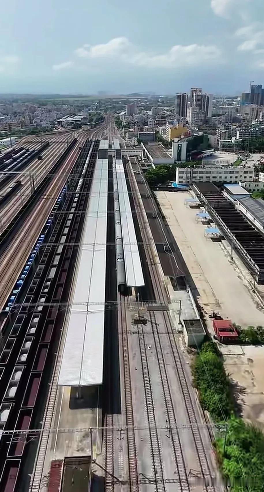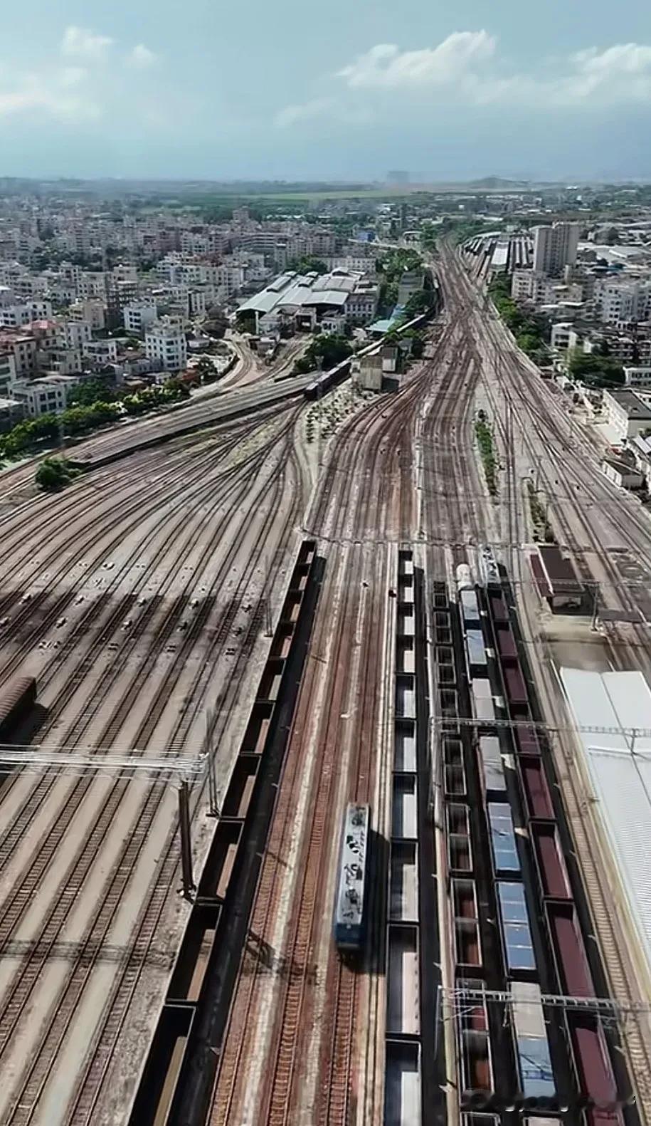航拍湛江火车站站场,这密密麻麻的轨道体现出湛江火车站的规模庞大。早年为了配合湛江港的港口运输,修建了黎湛铁路这条交通大动脉,并在湛江火车站设置了规模宏大的站场。整条线路和车站交给柳州(南宁)铁路局管辖。虽然现在湛江站的普速客运有些没落,但货运业务依然非常繁忙。未来湛江的铁路客运可能是以广铁管辖的湛江北站、湛江西站为主,承担前往珠三角的高铁客流。湛江火车站则保留数趟普速列车,维持北上与西部城市之间的交通出行。
