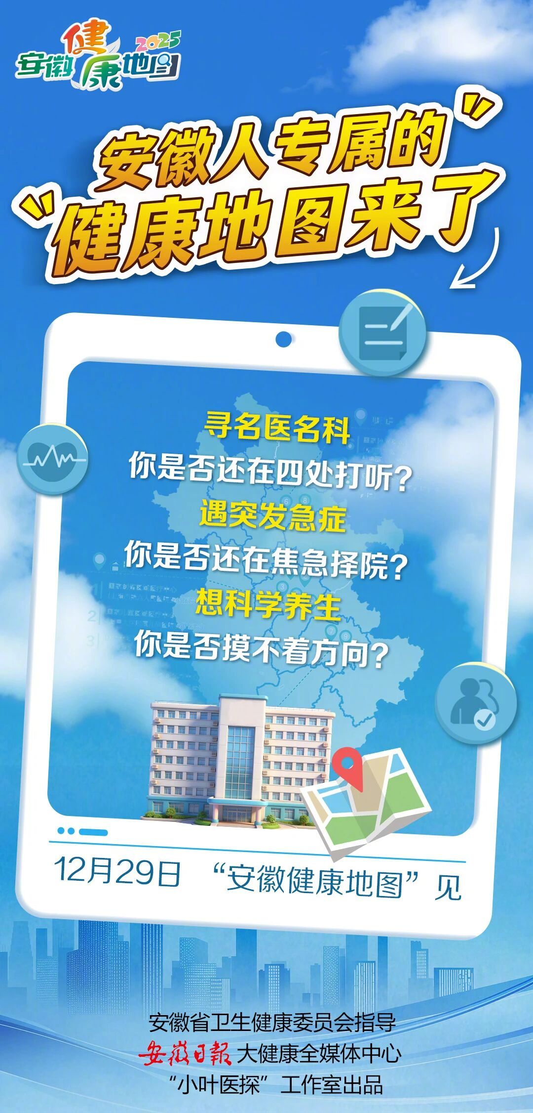 【#安徽健康地图#即将上线】#在安徽哪儿看病最安心# 哪些值得信赖的名医好科,在默默守护着我们?  紧急时分,如何让生命的通道最快被点亮?  我们身边,有哪些贴心又有效的安徽特色中医技术?当生命需要爱的接力,我们可以去哪里献出一份热血?岁末天寒,最暖不过守护相伴。12月29日,一份为咱安徽人量身定制的“健康礼物”——“安徽健康地图”,就要正式和大家见面啦!在“小叶医探”上线两周年之际,这份由安徽日报大健康全媒体中心精心打造的地图,把老百姓最关心的看病、急救、养生事儿都装了进去,把繁杂的医疗信息变成了看得懂、用得上的“导航指南”,为您指引就医路线,解答健康疑惑。咱安徽的医疗实力,这些年可是越来越强:9个国家区域医疗中心获批,数量全国第二;58个国家临床重点专科落地;省、市、县三级危重孕产妇救治中心有上百家;38个国家中医优势专科稳步推进;霍山石斛、亳白芍这些“十大皖药”道地药材,更是享誉全国……“十四五”期间,咱安徽卫生健康事业的这份“成绩单”,藏着的都是给老百姓的安心底气。这份好成果,怎么让咱老百姓一目了然?这就是“安徽健康地图”要帮大家解决的核心事儿。它是一张“寻医图”,让好医好科不再“藏得深”。地图里把全省的优质医疗资源梳理得明明白白:家门口的医疗“国家队”在哪?如何快速定位各大医院的“王牌科室”?头部医院的重点学科有啥过人之处?点开地图一看便知,让“大病不出省、小病不折腾”的心愿,慢慢变成日常。它是一张“救命图”,危急时刻能“精准指路”。卒中、心梗突然来袭,新生儿遇到危急情况,每一秒都关乎生命,找对能救治的医院太关键了!“安徽健康地图”整合了卒中、胸痛、危重新生儿三大急救网络信息,把全省的救治中心都清晰标了出来。在和死神赛跑的时刻,为您点亮最近的“生命绿灯”。它是一张“养生图”,把中医药智慧送进生活里。安徽中医药文化底蕴深,从“北华佗”到“南新安”,蕴藏着深厚的养生学问。这张地图就带您解锁这份“杏林传承”:哪里能享受到国家级中医优势专科服务?各地的特色中医疗法有啥妙用?“十大皖药”到底有哪些?它为您画好了一幅鲜活的中医药服务与文化全景图,让中医药防病治病、调理身心都有方向、有着落。健康在手,安心常有。“安徽健康地图”不是纸上冰冷的线条和文字,而是咱安徽人专属的“健康暖心手册”。我们盼着,这份有温度的指南,能让优质医疗资源“看得见、找得到、用得上”;更盼着,它能陪着您平安走过岁岁年年,把安康揣进兜里、把安心记在心里。12月29日,“安徽健康地图”将暖心发布,我们不见不散!(安徽日报 小叶医探)