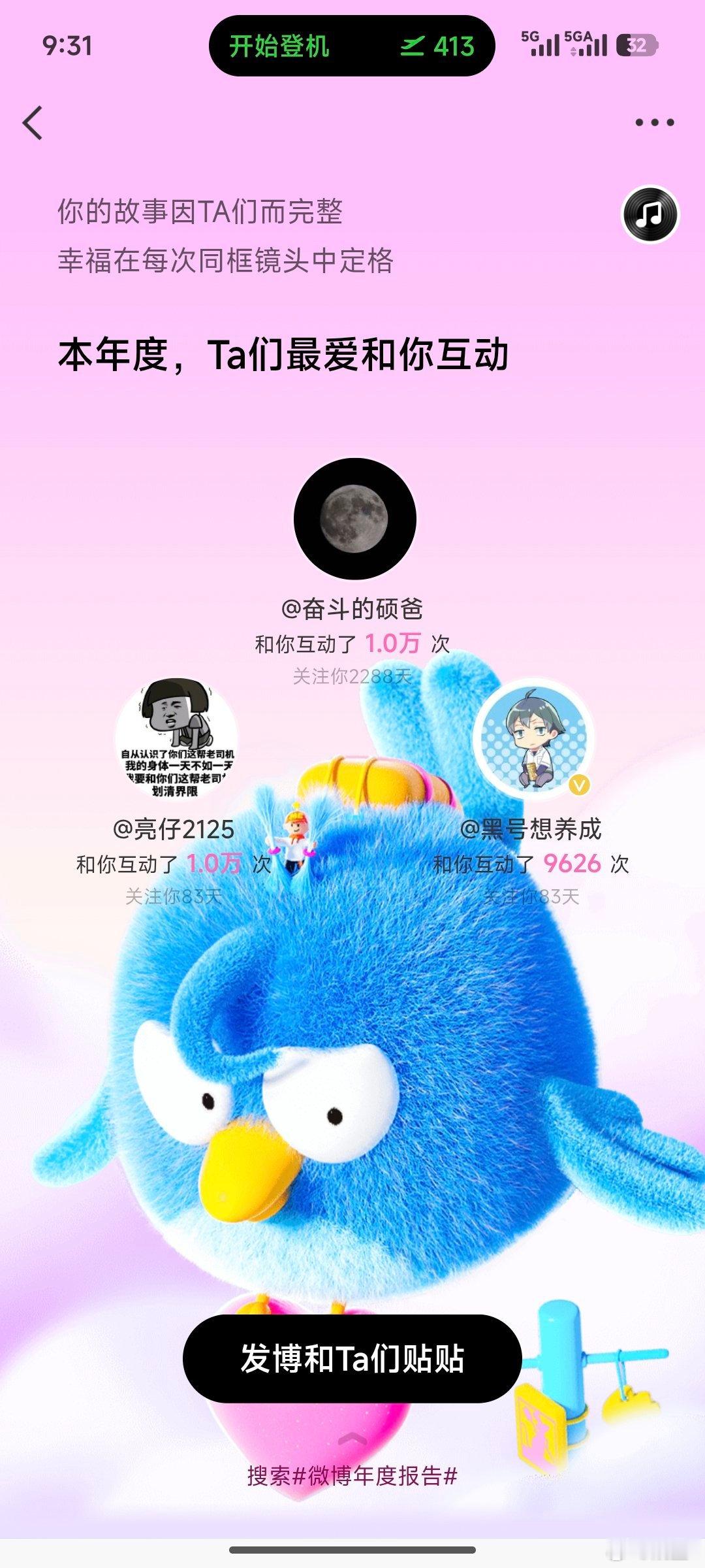 微博年度报告这一年简简单单发了三千多条微博平均一天9条吧,这频率兄弟们还满意不?另外图二的三位互动榜TOP 3粉丝大哥,后台私信我地址,给你们寄礼物哈哈哈~
