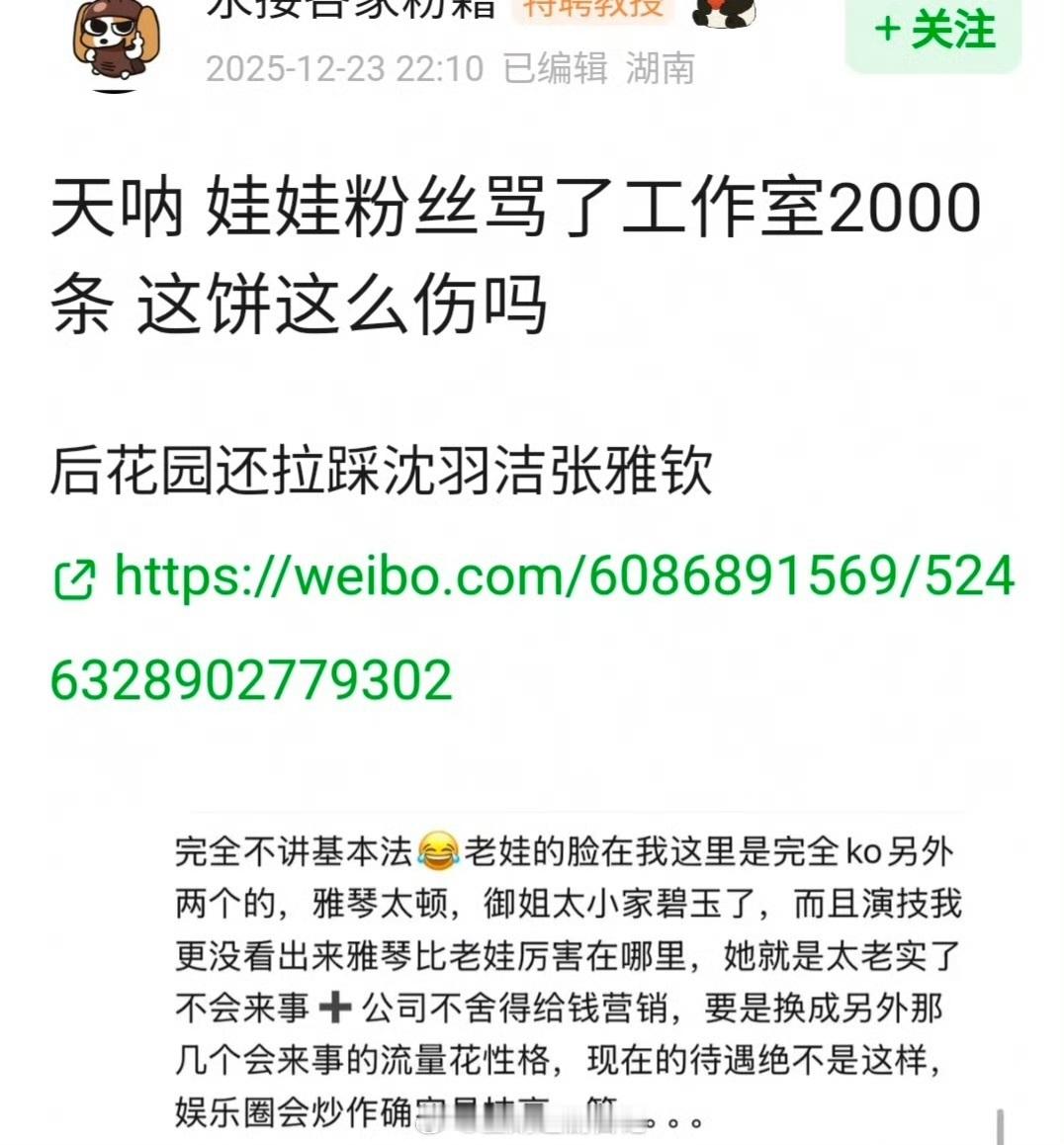 代露娃粉丝在工作室下面骂了2000条,排字永拒毒饼,还拉踩了张雅钦和沈羽洁