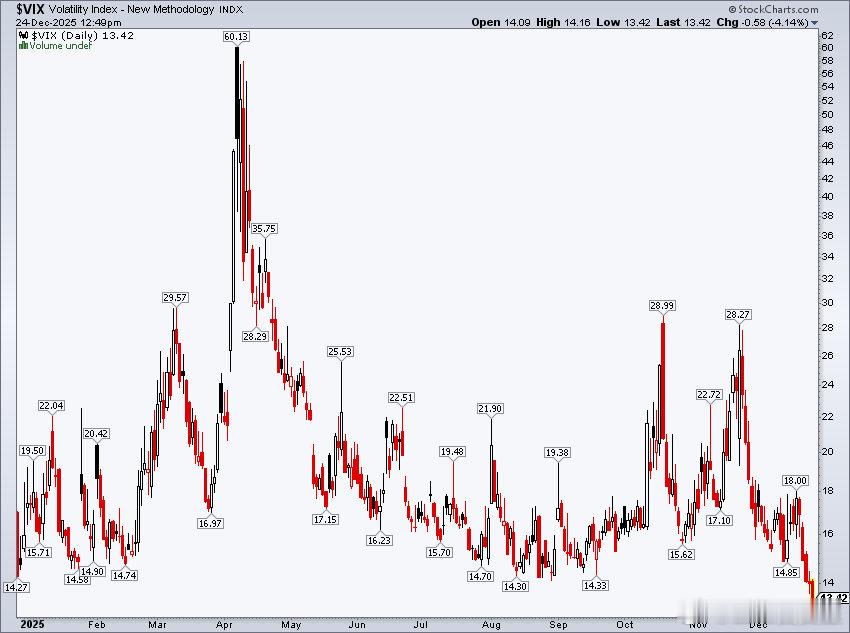 圣诞前夕,华尔街动荡指数降至14以下,今年最低点历史上,当这个数据半年内首次跌破