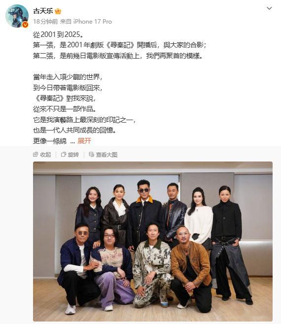 【古天乐晒寻秦记主创24年对比】这是真·时代的眼泪啊~电影版《寻秦记》即将上映,发文晒出2001年剧版《寻秦记》的照片,以及2025年电影宣传时大家的合影,好像有什么变了,又好像有些没有变。 剧版《寻秦记》被称为“穿越剧的开山鼻祖”,当年剧集一开播,就创下收视纪录,成为TVB经典作品。