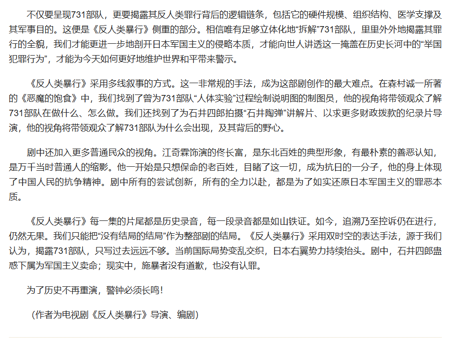 【《反人类暴行》导演:揭露731部队只写过去远远不够】导演算谈反人类暴行创作幕后