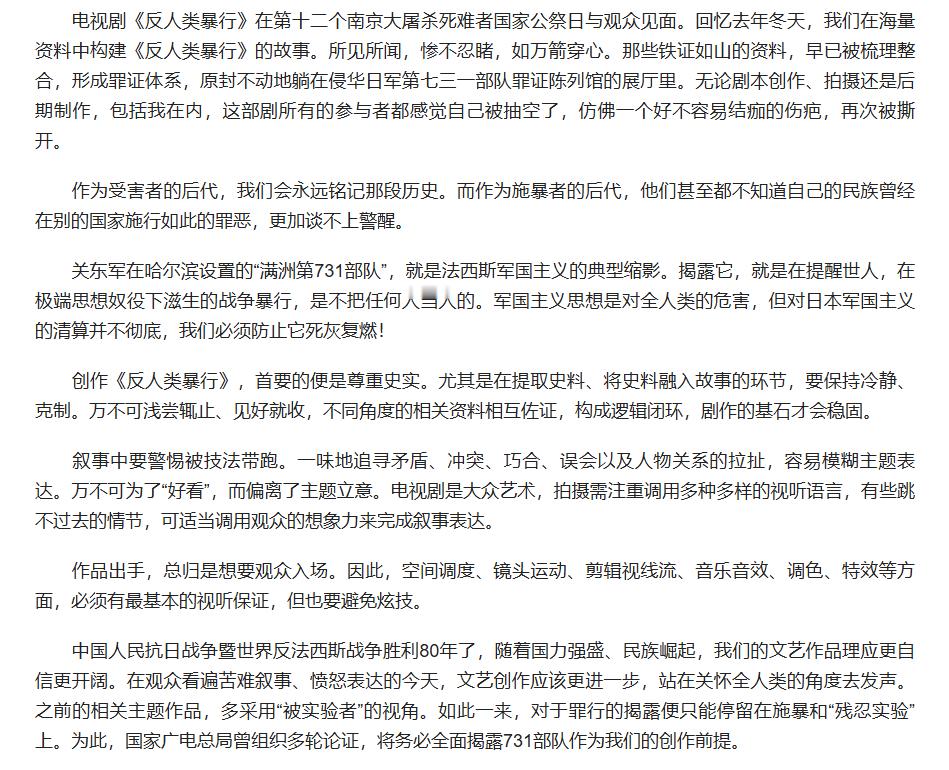 【《反人类暴行》导演:揭露731部队只写过去远远不够】导演算谈反人类暴行创作幕后近日,电视剧《反人类暴行》播出,收获极高口碑评分。导演、编剧算(牟芯岑)接受采访时表示,无论剧本创作、拍摄还是后期制作,这部剧所有的参与者都感觉自己被抽空了,仿佛一个好不容易结痂的伤疤,再次被撕开。“关东军在哈尔滨设置的‘满洲第731部队’,就是法西斯军国主义的典型缩影。揭露它,就是在提醒世人,在极端思想奴役下滋生的战争暴行,是不把任何人当人的。军国主义思想是对全人类的危害,但对日本军国主义的清算并不彻底,我们必须防止它死灰复燃!”“创作《反人类暴行》,首要的便是尊重史实。尤其是在提取史料、将史料融入故事的环节,要保持冷静、克制。万不可浅尝辄止、见好就收,不同角度的相关资料相互佐证,构成逻辑闭环,剧作的基石才会稳固。”“《反人类暴行》采用双时空的表达手法,源于我们认为,揭露731部队,只写过去远远不够。当前国际局势变乱交织,日本右翼势力持续抬头。剧中,石井四郎蛊惑下属为军国主义卖命;现实中,施暴者没有道歉,也没有认罪。 为了历史不再重演,警钟必须长鸣!(人民日报)