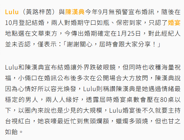 【经纪人回应lulu陈汉典婚期】据台媒,Lulu与陈汉典今年9月无预警宣布婚讯,随后在10月登记结婚,两人对婚期守口如瓶,只表示婚宴地点选在文华东方,近期有消息传出婚期确定在1月25日,对此经纪人回应:“谢谢关心,届时会跟大家分享!”此前,两人曾透露,婚宴桌数会压在80桌以下。(联合报)