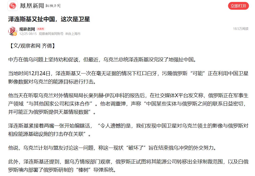 乌克兰副外长结束访华才不到10天!泽连斯基就又攀扯中国,而且一次比一次离谱! 当地时间12月24日,泽连斯基又没凭没据地瞎说,污蔑俄罗斯可能用中国卫星数据打乌克兰的能源设施。 他听了情报局长的报告后,在社交平台发文,老调重弹说中国有些机构和俄罗斯走得近,可能给俄方提供太空情报,还瞎编说中国卫星拍的乌克兰影像,和俄军打击能源设施有关。 说真的,每次看他这么无中生有,心里就堵得慌,明摆着是拿中国当挡箭牌,想把咱们拖进俄乌冲突的浑水,心思坏透了。 这还不是他第一次这么污蔑中国。早在今年4月,他就半夜在公开场合瞎嚷嚷,说中国给俄罗斯送武器和火药,可从头到尾拿不出一点证据,既说不出武器型号,也讲不清怎么运的,纯属瞎编。 咱们外交部当时就明确说了,从没给冲突双方送过致命武器,军民两用的东西也管得极严,这点泽连斯基心里门儿清。现在又拿卫星数据说事,换汤不换药,还是那套没证据就造谣的老把戏。 为啥他总盯着中国造谣呢?说白了就是自己日子过不下去了,想靠抹黑中国转移国内矛盾,还想讨好西方要援助。 俄乌打了上千天,乌克兰全靠西方军援撑着,可现在西方那边早就动摇了。美国特朗普政府一个劲给她施压,让他接受和平计划,还催着乌克兰搞总统选举;北约承诺的500亿美元军援也迟迟不到位。 乌克兰国内能源设施被打坏不少,冬天老百姓连电都用不上,怨声载道。泽连斯基管不了这烂摊子,又从西方要不到更多好处,就想出这下三滥的办法,把脏水泼给中国,一边让西方觉得他在对抗中俄好骗援助,一边让老百姓别盯着他的无能。 其实他说的中国卫星帮俄军打击,纯属胡扯。中国在俄乌冲突里的立场一直很明确,从冲突开始第二天就劝双方和谈,还派外交官去基辅、莫斯科斡旋。 就在12月18号,乌克兰的副外长还专门来北京和咱们磋商,说要深化中乌合作,遵守一个中国原则。要是中国真帮俄罗斯,乌克兰能主动找上门来谈吗?这根本说不通。 再拿事实说话,中俄合作都是光明正大的民用合作,和军事一点不沾边。2024年中俄做生意花了2448亿美元,大多是能源和农产品,比如俄罗斯给中国输天然气,都是用来给咱们老百姓供暖、做饭的。 中俄卫星合作也是为了方便边境通信,让两边老百姓和企业联系更顺畅,跟军事打击八竿子打不着。而且中国有严格法律,绝对不允许任何机构把相关数据用在军事冲突上,这是国际社会都公认的。 最有意思的是,泽连斯基一边造谣中国,一边还惦记着和咱们合作。中乌之前在农业上合作不少,咱们从乌克兰进口粮食,也给他们提供农业技术,都让乌克兰老百姓受益了。 现在他为了自己的政治利益说翻脸就翻脸,甚至放话要制裁中国公民和企业。咱们外交部早就警告过他,这种制裁违反国际法,中方肯定会维护自己人的合法权益。他真敢这么干,最后坑的还是乌克兰自己,以后谁还敢跟他们做生意? 说到底,泽连斯基扯中国卫星数据这事,就是一场自导自演的闹剧,核心就是骗援助、转移矛盾。中国的立场不会变,一直会劝双方和谈,不会被这种谣言绑住。 泽连斯基也该醒醒了,造谣解决不了国内的困境,再这么折腾下去,只会把乌克兰拖进更深的泥潭,害了自己的国家和人民。