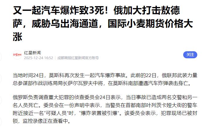 俄罗斯的报复来的太快! 12月22日,俄罗斯中将被汽车炸弹炸死了。而俄罗斯的报复就在当天,当时给了两个选择,是敖德萨还是基辅。现在答案出来了——敖德萨。 俄罗斯为啥不选基辅,偏偏盯着敖德萨打?答案其实很简单,这地方就是乌克兰的命根子。 乌克兰九成以上的海上贸易都得从这儿过,全国六成多的进出口物流也依赖这个港口,尤其是粮食出口。 这些年乌克兰全靠卖粮食换外汇撑经济,前线打仗的军援物资也得靠这儿接收,相当于整个国家的“造血泵”都在这儿。 俄罗斯这一拳打下去,比炸十座基辅的办公楼都管用,就是要一次性掐断乌克兰的生路。 其实俄罗斯这么快动手,早就有迹可循。这已经是一年内第三次俄军中将遭遇暗杀了,而且这次是首次在莫斯科核心城区得手,等于直接突破了俄罗斯的本土安全防线。 这次萨尔瓦罗夫遇袭,相当于把刀架到了俄罗斯脖子上,要是不快速反击,既没法给国内民众交代,还会让人觉得好欺负。 所以普京第一时间就下令彻查,当天就锁定了目标,这背后不光有现成的应对预案,更透着“人若犯我,我必犯人”的硬气。 更狠的是,俄罗斯还把这次报复和前线战场绑在了一起。 就在敖德萨被炸的同时,俄军东部集团军在库皮扬斯克、红利曼方向猛冲,南部集团军也趁机占了好几个战略高地,一天之内就拿下了乌军几十个阵地。 而乌克兰这边早就扛不住了,现在正被逃兵潮逼得焦头烂额,从2022年到2025年9月,光记录在案的逃兵就有5.4万,擅离职守的更是多达23.5万。 10月份一个月就跑了2.1万,现在每月能动员的人才3万,离前线需要的7万人差远了。 面对俄军的两面夹击,乌军只能从苏梅靠近边境的阵地仓皇撤退,泽连斯基当天就急着撤换了南方空军司令,火急火燎地找美欧求救要防空系统、远程导弹,可哪儿来得及。 说起来泽连斯基这阵子求援助也挺不顺的,12月15号还专门去柏林跟特朗普的特使碰头,为了要安全保障,都已经松口放弃加入北约的目标了。 虽然19号欧盟批准了2026到2027年给乌克兰900亿欧元贷款,但这钱是未来两年的,远水解不了近渴。 现在敖德萨港彻底停摆,停靠的民用船被击中起火,黑海航运的保险费之前就因为冲突涨了十倍,现在更是没人敢来,很多外籍货船直接绕着走。 乌克兰西部的煤炭运输因为铁路枢纽被毁断了档,热电厂的存煤只够撑10天,过阵子供暖、供电都成问题。 这其实也符合俄罗斯的一贯作风,他们的报复从来不是对等反击,而是加倍奉还。 2022年克里米亚大桥被炸,俄罗斯立马就炸了乌克兰全国的能源设施,让一半以上地区停电;2024年哈尔科夫军工厂遭袭,俄军直接把那儿的军工产能彻底摧毁。 这次萨尔瓦罗夫遇袭突破了本土防线,俄罗斯必须拿出超出预期的强硬态度,才能震慑住对手。 从22号清晨遇袭,到当天锁定目标,再到敖德萨陷入火海,俄罗斯这一系列操作快如闪电,狠辣又精准,就是要告诉对手:任何针对俄罗斯的恐怖主义行为,都得付出无法承受的代价。 现在乌克兰的困境还在加剧,这也给所有国家提了个醒,挑衅强者的代价,从来都是毁灭性的。 俄罗斯这次报复来得快、来得狠,但说到底,都是被一次次挑衅后的必然反击,是对自己核心利益的捍卫,一点都不意外。