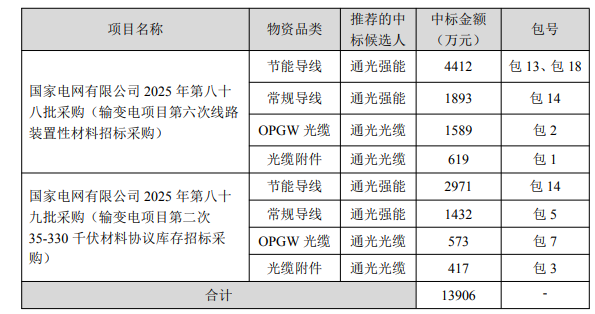 12月25日,通光线缆(300265.SZ)公告,公司全资子公司通光强能和通光光缆近日参与了国家电网有限公司2025年第八十八批和第八十九批采购,预中标金额合计1.39亿元。其中,通光强能中标节能导线和常规导线,通光光缆中标OPGW光缆和光缆附件。