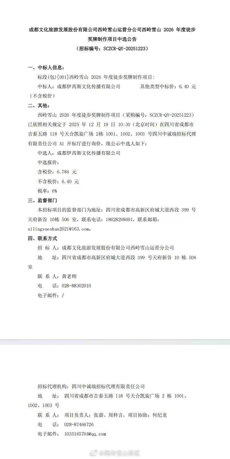 成都文化旅游发展股份有限公司西岭雪山运营分公司西岭雪山2026年度徒步奖牌制作项目中选公告