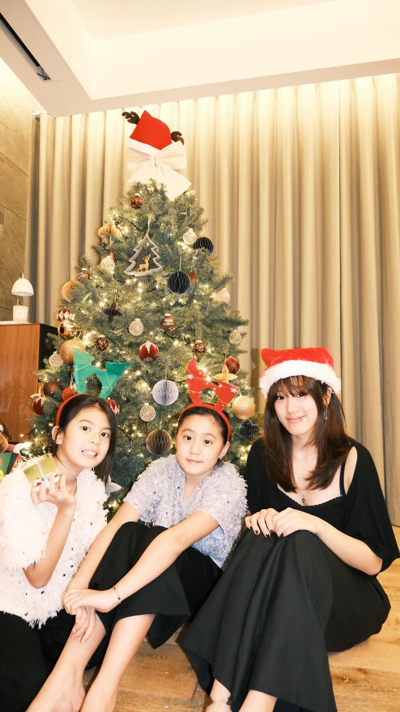 贾静雯一家子齐齐整整过圣诞,大女儿梧桐妹也在一起。贾静雯和老公都戴着圣诞帽,穿
