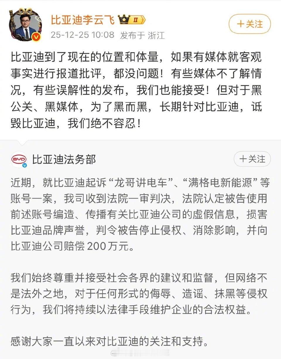 法院判决自媒体赔偿比亚迪200万元做得好!比亚迪再出重拳!12月25日官宣,“龙哥讲电车”“满格电新能源”等账号因编造、传播虚假信息诋毁品牌,一审被判停止侵权、消除影响并赔偿200万元,这已是比亚迪近期在名誉权诉讼中的又一场关键胜利。比亚迪的态度始终清晰:品牌及公关处总经理李云飞明确表示,接受客观批评与误解性发布,但对“为黑而黑”的长期诋毁绝不妥协。这并非孤例,此前“龙猪-集车”因5年发布300余条不实内容(如剪辑其他车辆起火视频嫁祸比亚迪),被判赔201.87万元且已强制执行;“王悟空说车”也因贬损方程豹车型赔偿31.38万元。从2021年悬赏5万-100万元打击黑公关,到如今将奖励提升至5万-500万元,比亚迪用持续的法律行动,构建起对抗恶意侵权的防线。这场胜诉的意义远超企业维权:法院明确“粉丝量大的博主需对言论负责”,法律界更指出其为行业划定了“舆论监督与商业诋毁”的边界,为其他车企提供了证据收集、影响证明的实操范本。结合国家网信办对汽车行业网络乱象的专项整治,比亚迪的坚持正倒逼车圈舆论回归理性,让竞争聚焦技术与品质,为新能源产业健康发展筑牢根基。