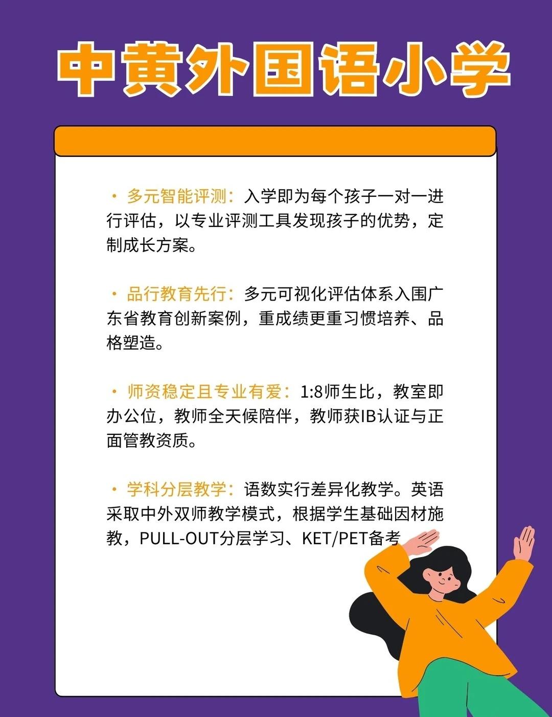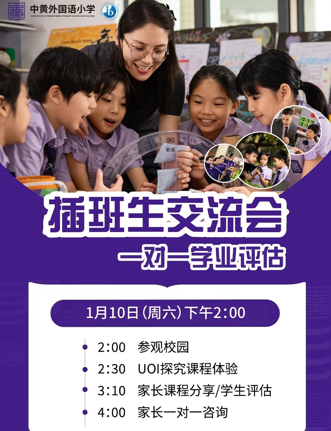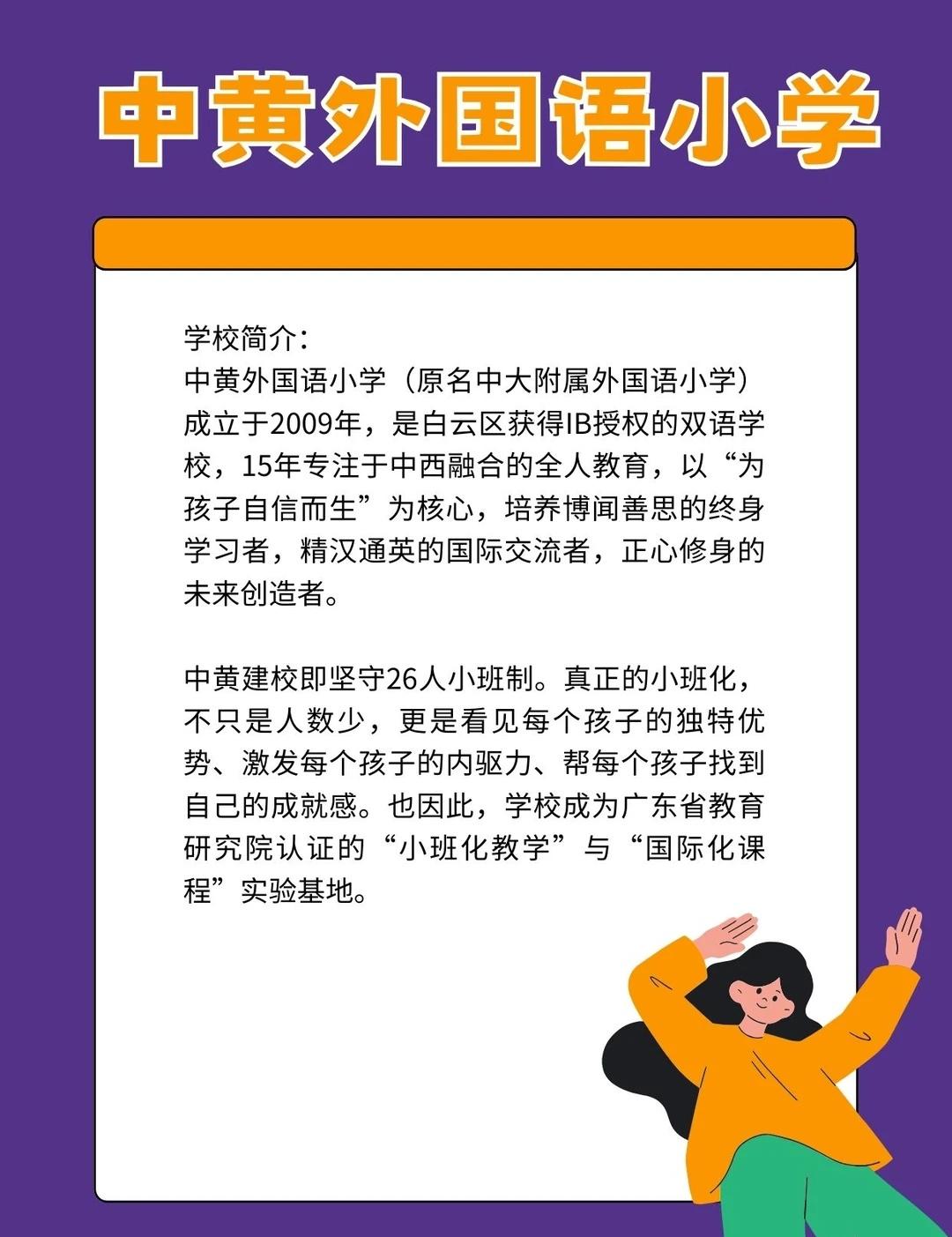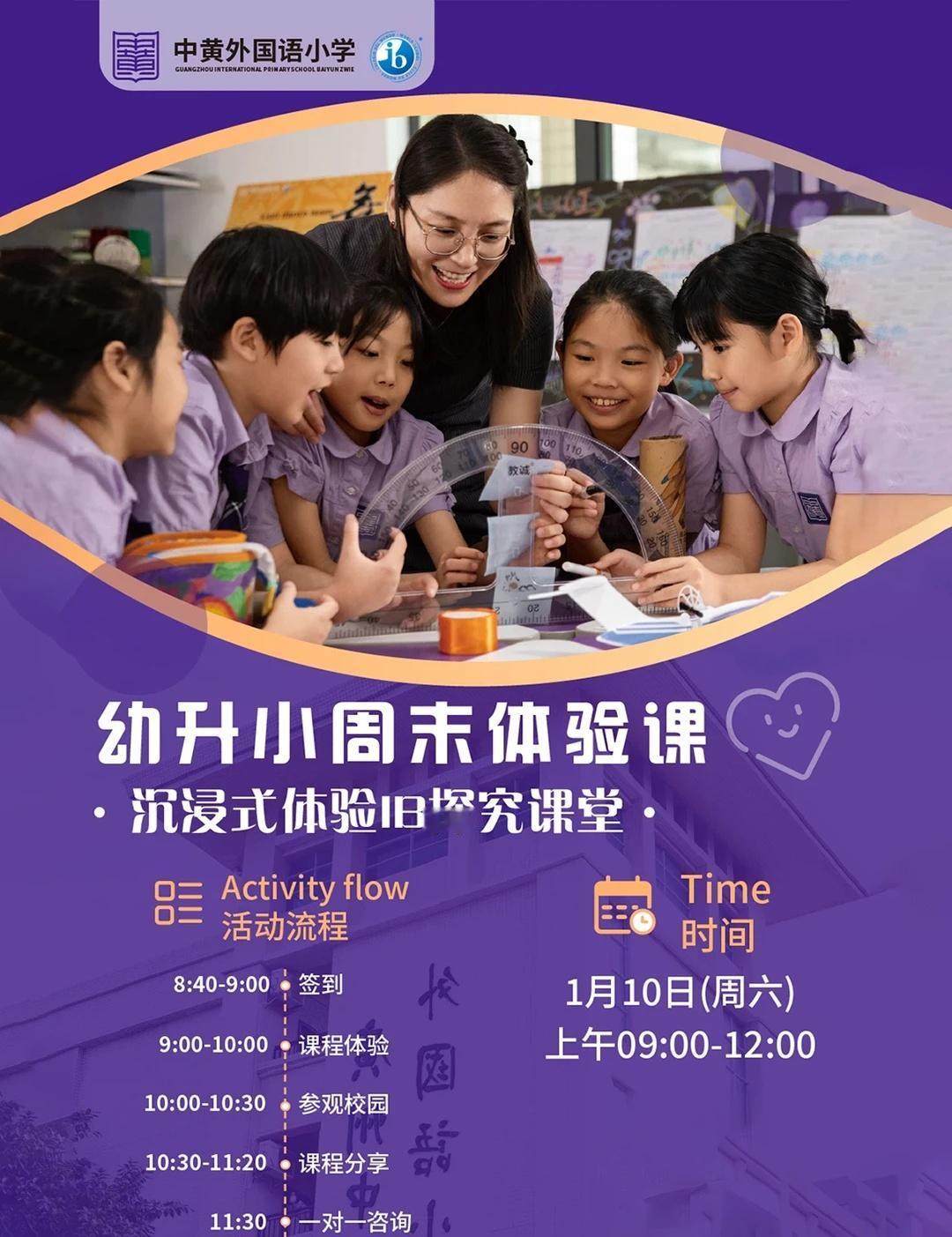 1月中黄外国语小学体验课及插班生交流会 🔹1月10日,广州白云区中黄外国语小学上午举办幼升小体验课,下午插班生交流会暨一对一学业评估开放日,为有幼升小及插班需求的家庭,搭建深度了解学校、适配孩子成长的桥梁,助力家长明晰教育选择,让孩子提前触摸IB融合教育的独特魅力。 🔹活动时间: 幼升小体验课(大班学生) 1月10日(周六)上午09:00-12:00 插班生交流会(针对2-6年级) 1月10日(周六)下午2:00 🔹学校简介: 中黄外国语小学(原名中大附属外国语小学)成立于2009年,是白云区获得IB授权的双语学校,15年专注于中西融合的全人教育,以“为孩子自信而生”为核心,培养博闻善思的终身学习者,精汉通英的国际交流者,正心修身的未来创造者。中黄建校即坚守26人小班制。真正的小班化,不只是人数少,更是看见每个孩子的独特优势、激发每个孩子的内驱力、帮每个孩子找到自己的成就感。也因此,学校成为广东省教育研究院认证的“小班化教学”与“国际化课程”实验基地。 🔹学校优势: • 多元智能评测:入学即为每个孩子一对一进行评估,以专业评测工具发现孩子的优势,定制成长方案。 • 品行教育先行:多元可视化评估体系入围广东省教育创新案例,重成绩更重习惯培养、品格塑造。 • 师资稳定且专业有爱:1:8师生比,教室即办公位,教师全天候陪伴,教师获IB认证与正面管教资质。 • 学科分层教学:语数实行差异化教学。英语采取中外双师教学模式,根据学生基础因材施教,PULL-OUT分层学习、KET/PET备考 欢迎 💌 预约参观或了解更多 国际学校 校园开放日 中黄外国语实验学校 招生季 择校