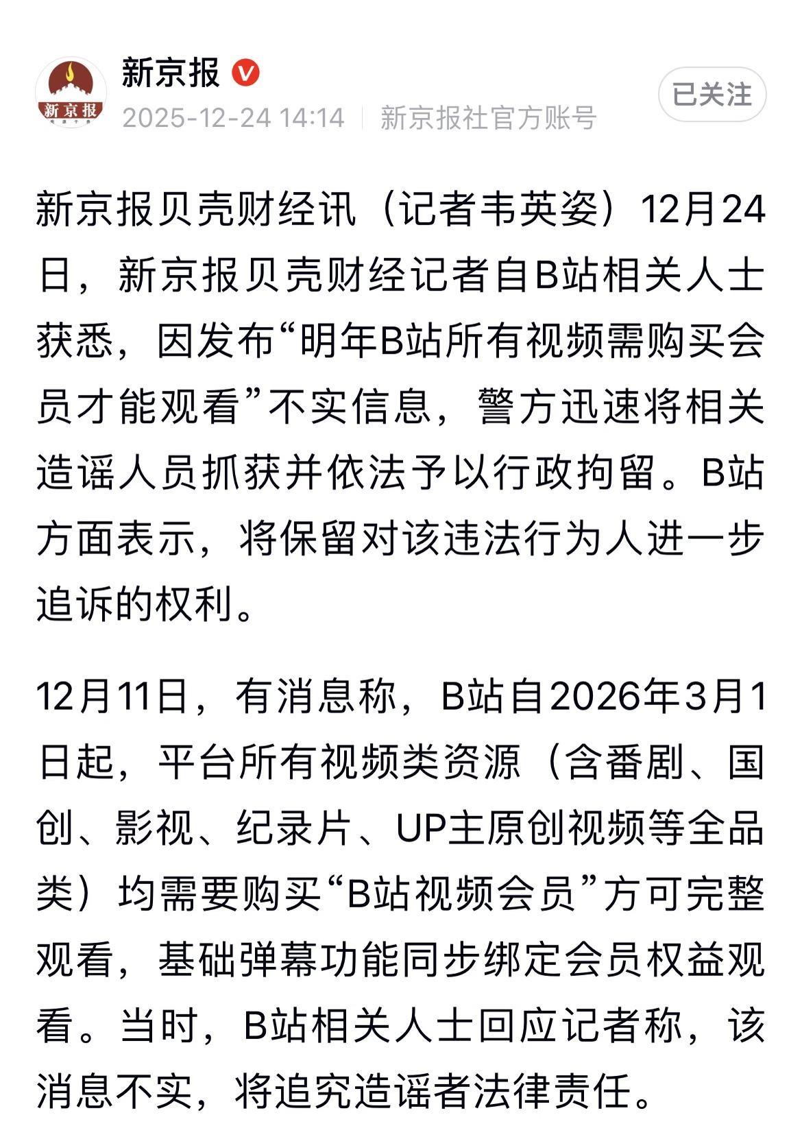 造谣B站全面收费的人被拘,一点也不冤! 一张AI伪造的公告加几句聊天记录,就造出“B站明年全面付费”的谣言,不仅把B站送上热搜,更把自己送进了拘留所。 这造谣的成本是真低,动动手指生成个假图就能搅乱全网;但辟谣可没那么简单!B站得紧急发公告、全网澄清,还得报警处理。警方出动调查,最后把造谣的人给抓了——行政拘留,真得进去蹲几天了。 点赞警察叔叔这次的高效率!也夸夸B站反应快,直接用法律武器保护自己。 想想看,要是谁都能随手编个谣言就引发一场风波,企业还怎么正常运营?天天光辟谣就够忙活了。网络不是法外之地,造谣的代价,可能就是局子。何必呢?