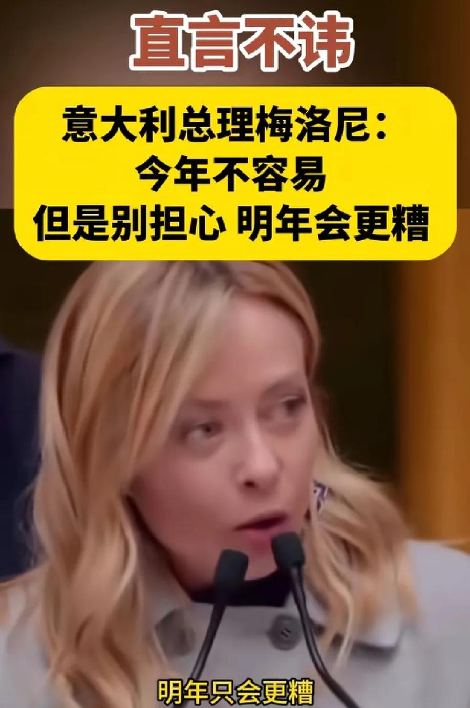 意大利总理,梅洛尼,这一年我们过得不容易,明年,我们只会更糟! 不得不说,西方人的乐观真是刻在了骨子里的,多悲观的事情说出来都这么有喜剧色彩! 为啥意大利这两年会不好过? 第一,欧盟不计成本的支持俄乌冲突中的乌克兰! 战争最是费钱,欧盟九百亿欧元虽说是贷款给乌克兰,但这笔钱却是要真金白银拿出来的,虽然是以乌克兰的资产为抵押,但短期内却是看不到任何红利的! 掏钱就意味着压缩本国民众的福利,转移给乌克兰,这是不争的事实! 第二,欧盟和东大的关系度过了蜜月期!中美争霸,死的必然是第三方,这是经过历史认定的事实,老大老二打架死的不一定是老二,反而是老三! 欧盟如今就处于这个尴尬的局面,内有俄乌冲突放血,外有关税大棒挥舞,美国打压不住中国,却是对欧盟下了死手! 斩断俄罗斯能源,增加关税成本,使得整个欧盟的商品输出成本大幅度增加,而商品的价格增长会使得欧盟的产品在国际竞争中不再有优势,市场份额会进一步降低! 梅洛尼倒是说了一句大实话,欧盟的日子以后只会越来越难!