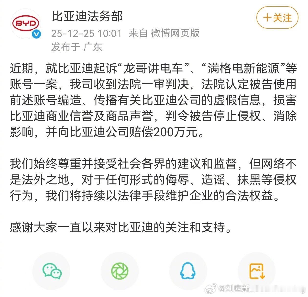 法院判决自媒体赔偿比亚迪200万元比亚迪打击黑公关一直在行动,对于无良媒体确实要
