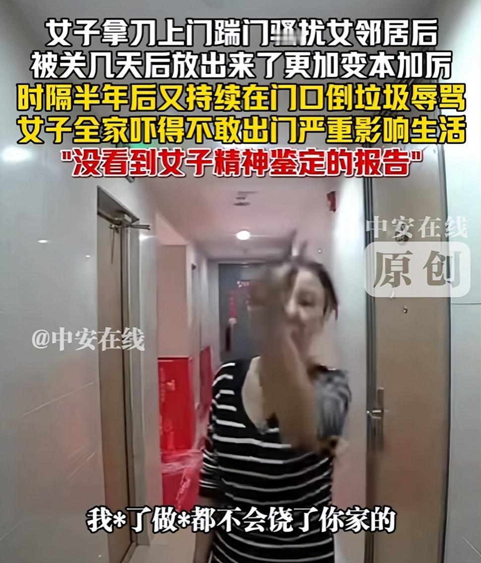 “精神病就是免死金牌” 这话的含金量还在上升!在大连刘女士家门前就应验得刺眼。为娃上学掏空积蓄买的房,如今成了全家不敢出门的 “囚笼”。 2024 年 10 月搬入新家,楼下 60 多岁独居阿姨就缠上了门,一口咬定她家是 “脑控组织”。起初划门贴字条,2025 年 5 月竟拎菜刀疯狂劈门,吓得孩子大哭、老人犯心脏病。报警后阿姨被送检,可几天就放了出来,反倒变本加厉。 三个多月里,馊水顺着门缝流,粪便抹在门把手上,辱骂声从早到晚没停过。孩子被迫休学,哮喘老人不敢开窗,买菜全靠外卖。警察来十几次只敢口头警告,物业更荒唐:“多忍耐,别冲突。” 刘女士理论时被邻居拿砖头威胁,保安反倒拉着她劝 “息事宁人”。 直到阿姨说 “上一家是我骂走的”,她才知前房主和中介早藏了猫腻。鉴定报告没见过,问题没解决,相关部门也没重视。 走投无路找媒体,门前的垃圾和刀痕都是血泪。精神病从不是施暴理由,“忍耐” 更不是义务。媒体不该是唯一救命稻草,别让安居梦死在失职的冷漠里!