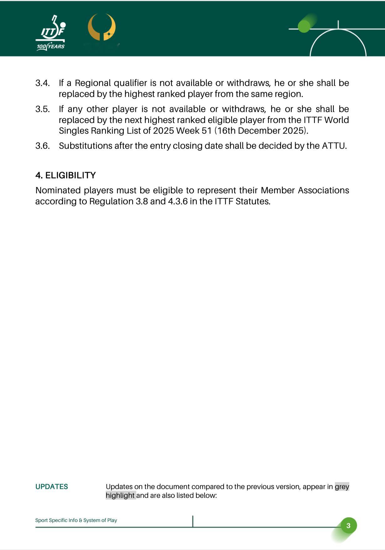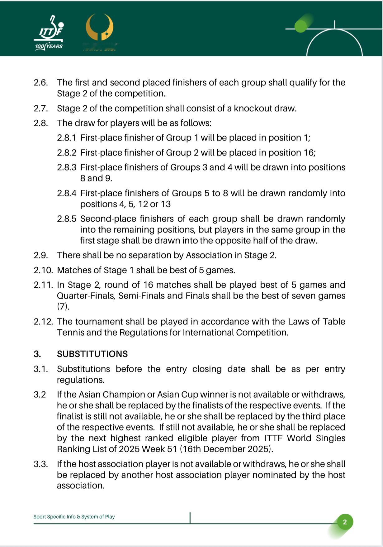 2026 ITTF-ATTU亚洲杯参赛资格与赛制【参赛资格】1、男、女各32名球员参赛;2、最新的亚洲杯冠军自动获得参赛资格;3、最新的亚锦赛冠军自动获得参赛资格;4、1位东道主协会提名球员;5、来自中亚、南亚、东南亚、西亚地区各世排前3的球员将获得参赛资格;6、17个世排名额;7、每个协会限4名球员参赛,但通过上述2、3、4条获得资格的球员除外;8、世排资格将根据2025年12月16日第51周世排确认;【赛制】1、种子位依据2026年2月3日第6周世排确认;2、比赛将由2个阶段组成;3、第一阶段,球员分成8组,每组4名球员,进行小组循环赛;4、第一阶段中,排名1-8位的球员,依次落入1-8组;其余球员,按照修改后的蛇形分组,依照排名顺序,每4个一次,抽签分入各小组中;5、同协会球员不会被分入同一个小组;6、小组前2晋级第二阶段;7、第二阶段为淘汰赛;8、第二阶段淘汰赛抽签落位规则如下:• 第一组的小组第1,落位1号签位;• 第二组的小组第1,落位16号签位;• 第三、第四组的小组第1,抽签落位至8号、9号签位;• 第五至第八组的小组第1,抽签落位至4号、5号、12号、13号签位;• 各小组第2,抽签落位至剩余签位,但第一阶段同组的球员,在第二阶段将半区回避。9、第二阶段没有同协会回避原则;10、第一阶段比赛为五局三胜制;11、第二阶段比赛,首轮1/8决赛为五局三胜制;1/4决赛、半决赛、决赛为七局四胜制。【替换】1、在报名截止日期前的替换须遵循报名规定。2、若亚锦赛冠军、亚洲杯冠军无法参赛或退出,则由该赛事亚军球员替换;若亚军球员无法参赛或退出,则由该赛事季军球员替换;若仍无法参赛,则由2025年第51周(2025年12月16日)国际乒联世界单打排名中下一位符合资格的最高排名选手替补。3、若东道主提名球员无法参赛或退出,则由另一位东道主提名球员替换;4、若区域资格球员无法参赛或退出,将由该地区世排最高的球员替换;5、若其他选手无法参赛或退出,则由国际乒联2025年第51周(2025年12月16日)世界单打排名榜中排名次高的符合资格选手替补。6、报名截止日期后的替换由ATTU决定。被提名选手须符合国际乒联章程第3.8条及第4.3.6条规定,具备代表所属会员协会参赛的资格。