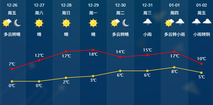明天(26日)更冷,最低气温0~-1℃,局部有薄冰,山区-2~-4℃,有冰冻,比今天偏低5℃左右。白天虽有阳光登场,但如同冰箱里的灯,起不到升温作用,预计最高气温仅7℃左右。好在27日白天起开始回暖,午后体感会比近期暖和不少。但回暖有限,预计本周双休日最高气温可升至14-17℃,以晴到多云天气为主,天气晴好,洗晒出游两相宜。