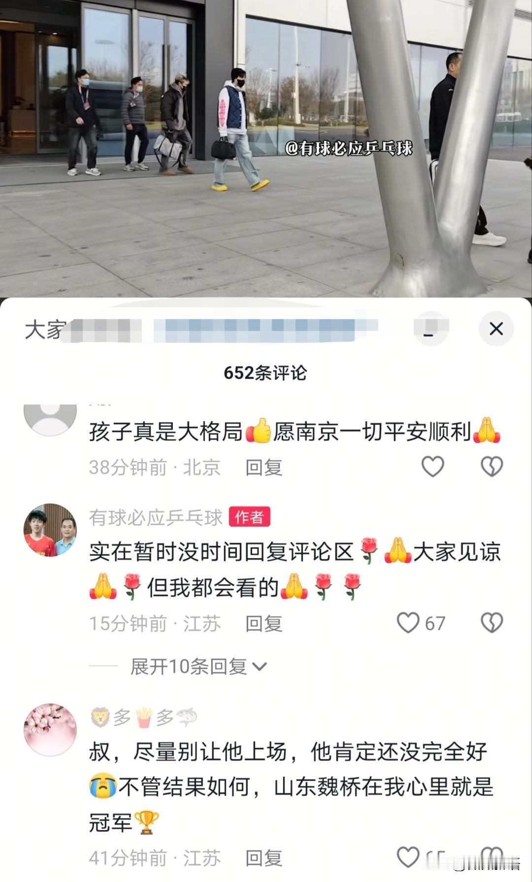 魏桥叔:你在,就是我们的底气…… 今天下午,山东魏桥的运动员也都抵达南京,魏桥的叔去机场接到王楚钦了。每次比赛,魏桥的叔都会把楚钦照顾的很好,这次大家都知道王楚钦的伤还没恢复好,也会更加关注他的健康,看王晨策也一路陪着头哥,曹巍也来了,曹巍和黄友政、梁靖崑、林昀儒他们走在一起。 魏桥的叔去接楚钦时,又赶紧把小白箱拎在手里了,他走在前面,楚钦跟在他身后,王晨策在楚钦的身后,走到车跟前,魏桥的叔先让他们上车了。把楚钦他们接上以后,看到魏桥的叔还发了抖音,他说楚钦在就是他们的底气,可一定要健康第一啊!南京,我们来了,看到楚钦来南京,真的是觉得这孩子大格局,虽然受伤还没恢复好,但是他来了,因为他觉得魏桥给了他家的温暖,魏桥的人也会把楚钦照顾的很好。 看到有网友给这个叔留言说,千万别让楚钦上场,他的伤看着还没好。不管楚钦上不上场,我们支持他就好,尊重他的决定,看到他带着小白箱来了,肯定还是要训练的。乒超总决赛结束后,1月份的比赛楚钦都不参加,他也有时间可以好好养一下身体了。
