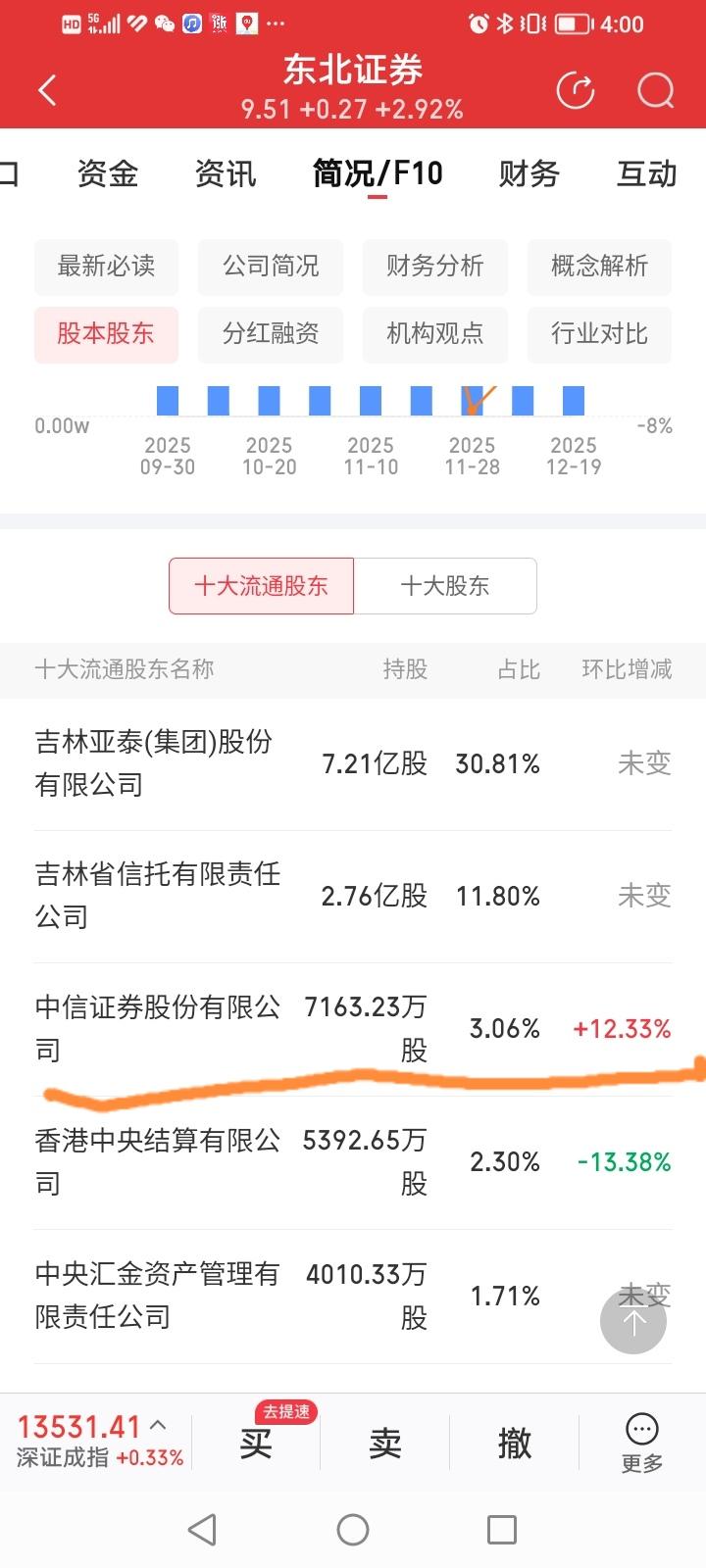 东北证券,今天收盘上涨2.92%,涨幅居券商股涨幅排行榜第一名。 东北证券似乎是今年走势最稳健的小市值券商股,股价不温不火,始终依托60日均线稳步上行。 目前东北证券总市值222亿元,动态市盈率15倍左右,市净率仅1.12倍,很像一只小而美的券商股。 目前中信证券是东北证券的第三大股东,持仓占比3.06%,持仓离举牌还差1.94%,中信证券会举牌东北证券吗?