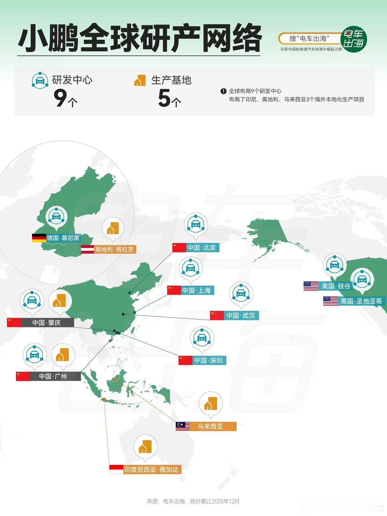 今年马上要过完了,如果要问今年哪个新能源汽车品牌的出海成绩最亮眼,小鹏绝对算得上是其中的佼佼者。今年前 11 个月,小鹏海外市场交付量达 39,773 台,同比大幅增长 95%。细分市场数据更为突出:前 11 个月,小鹏在亚太(含中国)市场销量同比增速高达 170%,欧洲市场同比增长 161%,中东市场同比增长 66%,全球整体销量同比增幅达 156%。市场表现上同样可圈可点,今年 11 月,小鹏拿下北欧市场中国品牌销量冠军。而在 1-11 月的累计排名中,小鹏在全球 10 个国家跻身中国新势力纯电品牌销量榜首,在另外 8 个国家位列第二,强劲的发展势头一目了然。为支撑全球业务的持续拓展,小鹏已构建起覆盖全球超 50 个国家、共计 321 家的海外销售服务网点,同时在全球布局了 9 个研发中心。今年以来,小鹏已经陆续在印尼、奥地利(和麦格纳一起合作)、马来西亚这三个地方,搞起了海外本地化生产的项目。从这也能看出来,小鹏已经不只是单纯卖车出口了,而是朝着 “研发 + 制造” 一条龙的全球智造路线走。小鹏获海外10国新势力销量第一小鹏夺北欧中国品牌销冠
