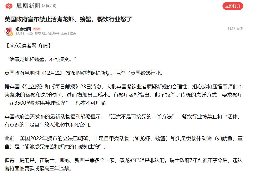 英国可真是餐饮界的“活菩萨”! 英国政府12月22号出了个新规,不让活煮龙虾、螃蟹,这下直接把餐饮行业惹毛了。本来这两年餐馆生意就不好做,政府一句话又给添了个大麻烦。老板们、厨师们都气坏了,吐槽这规矩太不切实际,根本不管他们的难处,说是保护动物,其实就是逼小餐馆关门。 最让他们生气的,还是钱的事儿。新规说不能活煮,得用电击设备把海鲜电晕,或者放冰箱冻晕。 可一台电击设备要3500英镑,合人民币三万多,这可不是小数目。有个伦敦餐馆老板直接怒了:“本来就勉强撑着,哪有钱买这专门电龙虾的玩意儿?” 英国大多小餐馆都是薄利多销,这两年成本、工资都涨,不少都亏着本,再额外花这笔钱,纯属雪上加霜。 除了买设备要花钱,处理海鲜多出来的时间和人工,更是让餐馆扛不住。有个小餐馆老板说,他那厨房小,就六张桌子,厨师备餐本来就赶得要命。现在处理一只龙虾得多好几个步骤,先电击再宰杀,效率直接降下来。 饭点客人催单,厨师根本忙不过来,要么多雇人加成本,要么让客人等久了丢生意。而且政府也没说清楚怎么查,总不能让首相天天蹲厨房看吧?这话说着是调侃,其实全是无奈。 更让他们受不了的是,这规矩要断了老祖宗传下来的烹饪法子。有老板做了十几年餐馆,一直用传统手法处理海鲜,在他看来这不仅是谋生,更是种手艺。 现在政府一句话就给否定了,心里肯定不舒服。而且他也说,现在没几个厨师会活煮了,大家都知道用刀快速杀了,又人道又不影响口感,根本不用政府瞎操心立法,这就是政府想装好人的作秀。 更要命的是,这规矩可能把英国本地的海鲜产业搞垮。有行业协会的人说,餐馆买不起设备,就会不买本地鲜活海鲜,改买进口冷冻的,到时候渔民、批发商都得完蛋。 有个做了三十年海鲜生意的老板说,本来成本压力就大,这新规更是额外负担,再这么折腾,同行们都得关门。 而且进口冷冻海鲜的运输过程,动物福利根本没人管,所谓的保护纯属自欺欺人。 有人说禁止活煮是保护动物,这话听着对,但得先想明白一个关键问题:保护动物到底该怎么保护? 其实保护动物本身是件好事,能体现对生命的尊重,但要是不分情况、不管实际,什么动物都一股脑地去“强行保护”,那就是典型的圣母心泛滥了。 真正的动物保护,应该是兼顾生命权益和人类社会的实际运转,而不是搞一刀切的极端做法。 像英国政府这样,为了彰显自己“爱护动物”的形象,完全不顾餐饮店家的生存困境,用无数小餐馆的巨额损失、从业者的失业风险来换自己的“爱心名声”,这种做法实在让人难以评价。 更现实的是,这规矩根本没法查。政府没说清楚违反了罚多少钱、坐不坐牢,也没说怎么检查。餐馆老板都说,这种只下命令不监管的政策,跟没说一样,就是添堵。 有政客都看不下去了,说政府这是瞎管,真要保护动物,不如去管管廉价鸡肉的饲养条件,别盯着龙虾怎么煮。 说到底,这新规就是政府脱离现实的道德秀。动物福利重要,但政策得考虑行业实际。 餐饮行业怒的不是保护动物,是政府不管他们死活。设备钱、人工钱、本土产业受冲击,每一样都戳中痛点。 政府不补钱、不指导,就硬推禁令,最后只会坑了从业者和本土产业。这种只讲情怀不讲实际的政策,难怪全行业都反对,实在太不应该了。