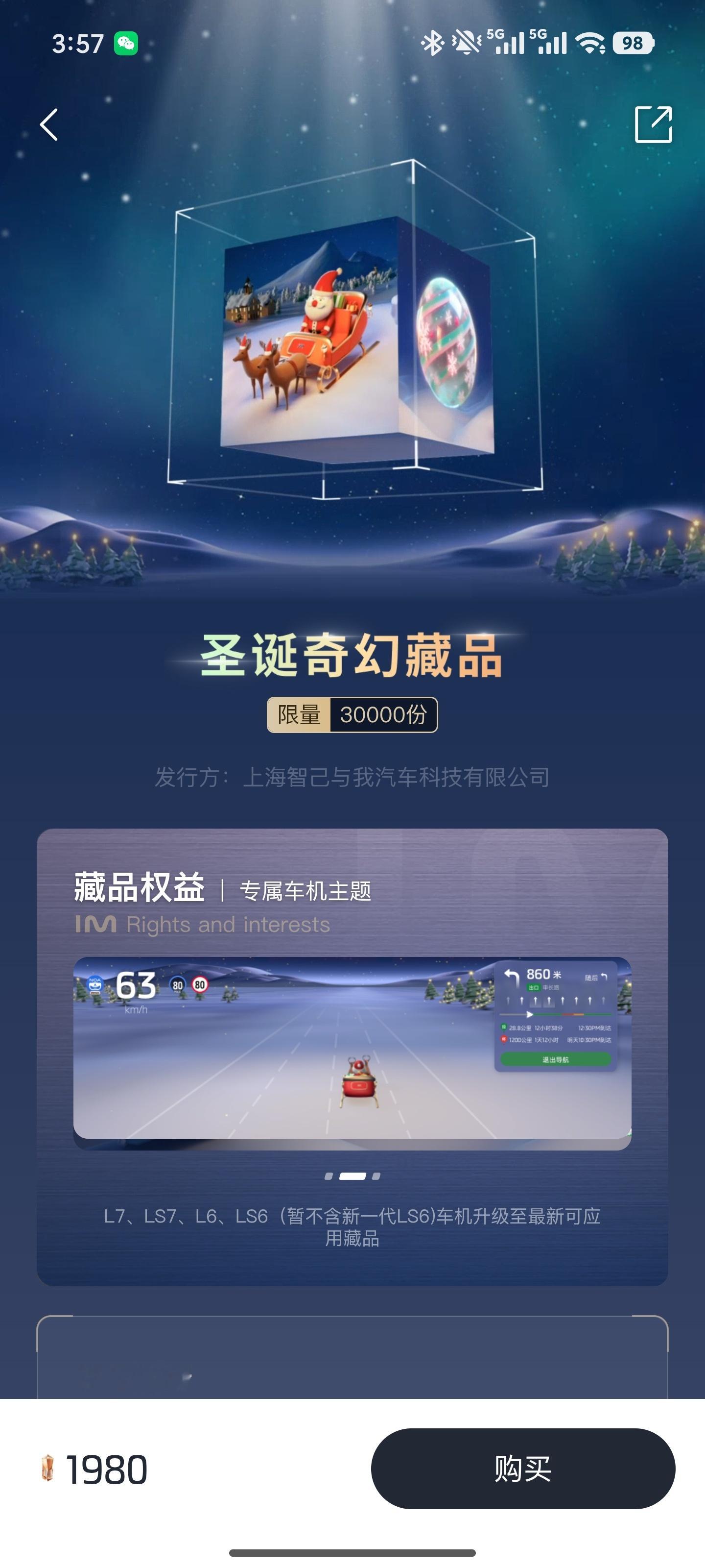 真喜庆~一上车,这氛围感就来了~就是我太穷了,水晶太少,连个圣诞车机主题都买不起,建议圣诞这天,此主题免费用~~哈哈车加智能的智己ls6车加智能的智己LS6