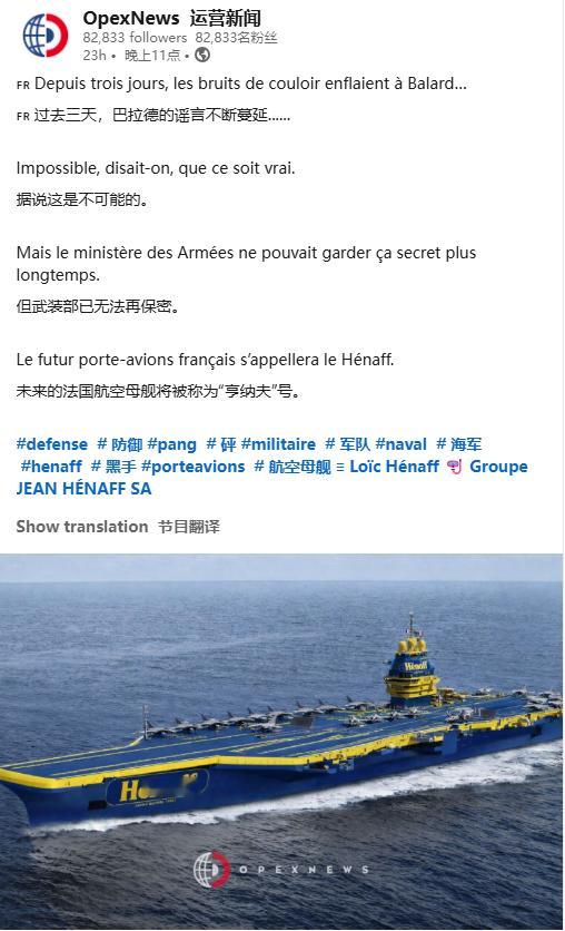 洋葱军事图片 法国下一代航母“Hénaff”号,Hénaff是法国著名的布列塔尼猪肉酱品牌(pâté Hénaff),罐头是标志性的蓝色+黄色,大概相当于中国的老干妈辣酱。在法国海军中,有一句经典的俏皮话:“Pâté Hénaff, le pâté du mataf”(Hénaff猪肉酱,水兵的猪肉酱),因为这种酱料耐储存、营养高,常被海军当作 rations(军粮)携带。法国军事媒体OpexNews用Photoshop做了一张假图:把PANG航母涂成Hénaff罐头的颜色,并假称命名为“Hénaff”,正好赶上圣诞节(12月25日),很多人转发调侃,说“是1月1日还是4月1日(愚人节)?”、“这下海军有吃不完的酱了”、“敌人会笑死的”等等。甚至Hénaff公司老板Loïc Hénaff本人在评论区发了“🤪🎄”(疯狂+圣诞树),表示好玩。
