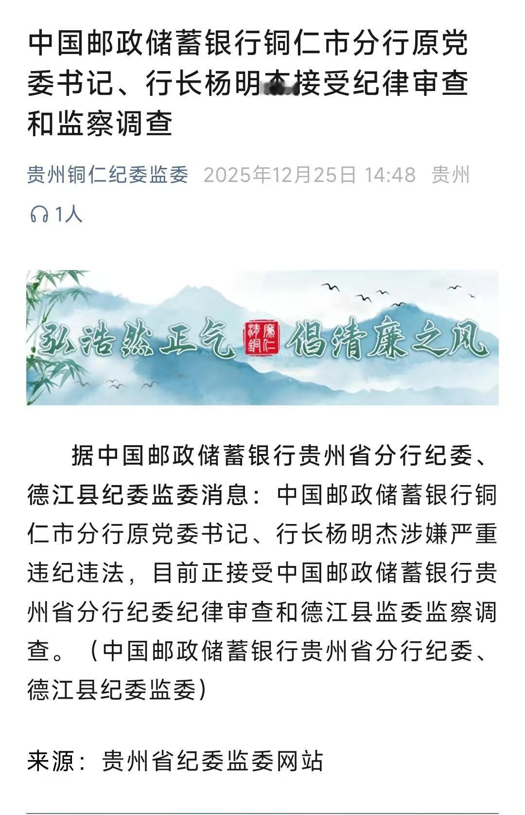 中国邮储的杨明杰,东窗事发了。 这个杨明杰不简单,网上关于他的公开资料很少,出生年月不详,大学学历,在职研究生。 但从官网发布的照片来看,他有一头乌黑的头发,平日里对于个人形象特别注重,头发梳的是一丝不乱,戴着一副眼镜,看上去十分斯文儒雅,年龄大概在50岁往上。 他算是中国邮储的老人,从学校毕业之后,便来到了中国邮储工作,尤其是在中国邮储贵州系统工作多年,从一名普通员工,一步一步晋升为中国邮储银行遵义市分行副行长。 离开遵义之后,又调往贵阳,晋升为中国邮储银行贵阳市分行行长。 2018年以后,又调往铜仁市,担任中国邮储银行铜仁市分行党委书记、行长。 关于他的公开活动报道,则主要停留在2020年、2021年之间,2021年以后,鲜少有报道。 中国邮储银行虽然不是四大行,但是其规模和金融实力,也是中国银行业的头部。 其大大小小的网点,分布在中国的角角落落。 其市场定位,则更侧重于零售业务和农村地区服务。 在如今这个社会,就业压力本就大。多少莘莘学子们从高校跨入社会,没有选择考研,反而是想考事业单位。 因为学子们认为,考研的价值已经不大了。考公考编的价值大于考研。 多少学子为了上岸,夜夜苦读,夙兴夜寐,只为了拿到一个铁饭碗。 杨明杰身为银行高管,已经达到了很多人半生难以达到的高度,享受着高薪待遇,却依旧欲壑难填,这样的人,就算今天不出错,只要贪心在,总有一天也会栽跟头。 因为古人说的一句话,贪心不足蛇吞象,永远都是至理名言。