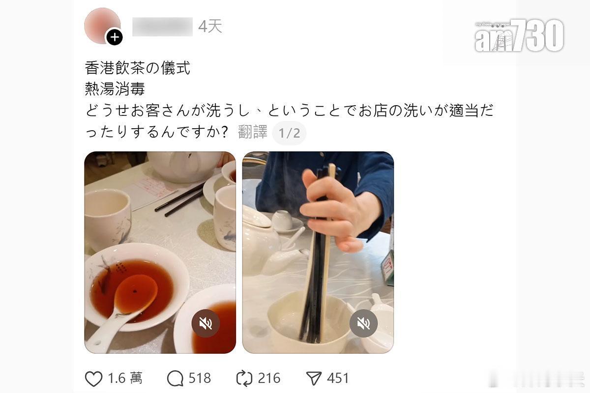 日本游客学烫碗筷,香港网民用日文大赞尊重香港文化AM730报道,有日本游客访港期间光顾酒楼,期间用茶清洗餐具和筷子等,他之后形容这是在港饮茶的常见动作,又指有人会好奇「是否反正客人会自己洗餐具,所以店家会清洗得较随便?」帖文吸引大量香港人留言解答,部分人更专诚翻译成日文回应,「由于清洗餐具属于低薪工作,清洁时可能较随意,所以客人一般会要求提供一壶热水作『二次清洗』,冲掉可能残留的污迹」、「第一泡茶也是洗茶叶,顺便清洁碗筷杯子」、「即使餐具已经清洗过,客人为谨慎起见仍会用第一壶茶再清洗一次。」香港网民不少人感谢访日游客尊重香港传统,「非常感谢你亲自来香港,并积极学习这里的文化」、「当你尊重其他地区文化时,你总是会被视为真正的旅客并受到欢迎」、「你的做法是对的,但如果可以选择,最好使用茶壶里的热水来清洗。」发帖的游客收到很多分别用日文、中文和英文撰写的留言,他事后回复感谢大家的分享。粤港澳大湾区日本高官拥核言论绝非孤立事件