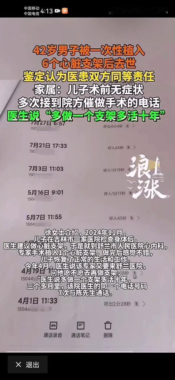 太揪心了!42岁男子无症状被劝装6个支架,术后8天人没了!42岁的陈先生之前装过1个支架,身体没有不舒服挺好,结果医院3个多月打7次电话,催他再去做手术,说多装一个多活十年。等到手术那天,承诺的外地专家换成了本院医生,一次性给他装了6个支架!术后刚回病房,他就说胸口闷,医生还说是正常反应,半小时就心脏骤停,抢救8天还是没保住命。 鉴定说医院没评估手术风险、不该随便做手术,有过错!可又说患者自身病情重,判了个同等责任。调解只赔50万,家属根本接受不了,术前好好的人,怎么就没了? 朋友们看病一定要盯紧手术指征,没症状别随便挨刀子,签字前问清风险,别被忽悠了! 男子被植入6个支架后心脏骤停去世