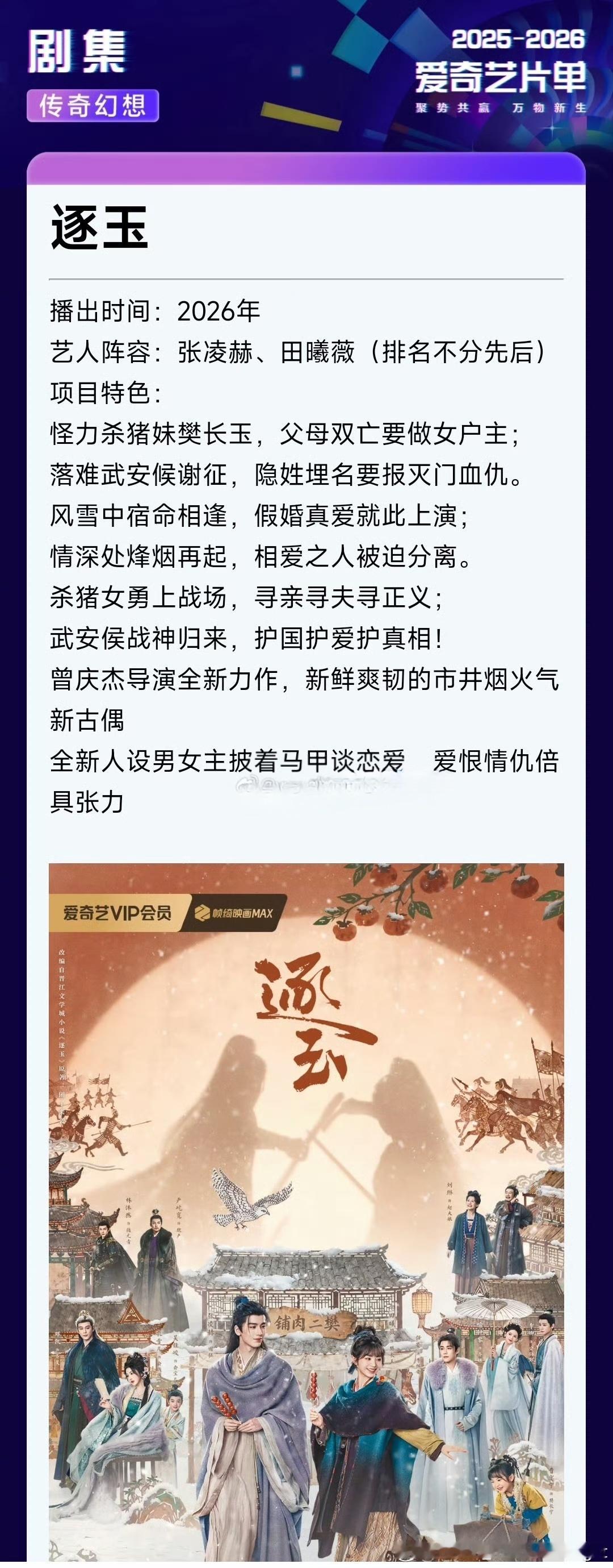 张凌赫和田曦薇的《逐玉》啥也没干就热搜了,这热度真高啊这剧暂定爱奇艺腾讯2026播出的开年大剧,鹅桃两个大平台对这部剧期待很高,感觉也是按爆剧标准去做剧的