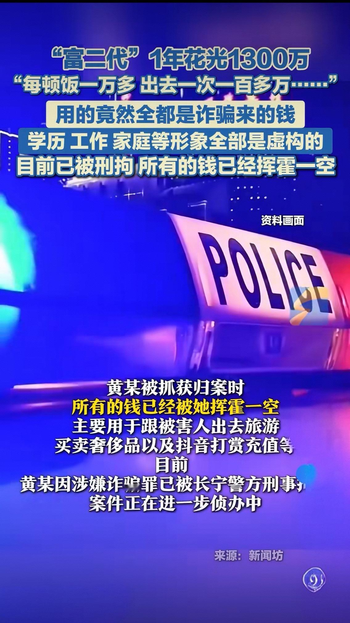 1年挥霍1300万!"富二代"每顿饭万余元,真相撕开人性最贪婪的一面 朋友圈里的包机出游、奢侈品堆成山,每顿饭动辄一万多,出去一趟就花掉上百万——黄某打造的"顶级富二代"人设,让刘女士深信不疑,甘愿一次次转账相助。可谁能想到,这光鲜亮丽的生活背后,全是用诈骗来的钱财堆砌的泡沫。 2024年10月,刘女士与黄某因兴趣相投成为好友。黄某自称家境优渥,是知名信托公司精英,主营古董拍卖和奢侈品交易,社交平台上满是高端消费的照片,一步步获取了刘女士的信任。当黄某抛出"8000万境外转账,平分4%返利即160万"的诱饵时,刘女士毫不犹豫地答应了。 接下来的数月里,黄某以垫付利润、律师费、汇率差等名义,一次次让刘女士转账,金额从几千到十几万不等。为了那笔虚无缥缈的返利,刘女士不仅掏空积蓄,还向亲友借款、申请银行贷款,前前后后共转账1300余万元。而她不知道的是,自己眼中"出手阔绰"的好友,其实是无业游民,所有高端消费的钱都来自她的转账。 黄某用这些赃款,带着刘女士环球旅行、包机出游,奢侈品想买就买,还在抖音直播间大额打赏充值,把别人的血汗钱当成挥霍的资本。直到亲戚上门讨债,刘女士才幡然醒悟,在家人陪同下报警。当警方远赴外省市将黄某抓获时,1300万已被挥霍一空,只留下背负巨债的受害者和虚假人设的残骸。 这起案件撕开了人性的贪婪与虚荣:黄某用最低成本的人设包装,收割着他人的信任与财富;而刘女士则因一时贪念,陷入了"沉没成本"的陷阱。法律不会纵容恶行,黄某因涉嫌诈骗罪被刑事拘留,等待她的将是法律的严惩。但更值得深思的是,在这个充斥着虚假人设的时代,那些完美到不真实的光环背后,可能藏着最恶毒的算计。 信任可贵,贪念害人。你身边有没有遇到过过度包装的"完美人设"?欢迎在评论区分享你的经历和看法。