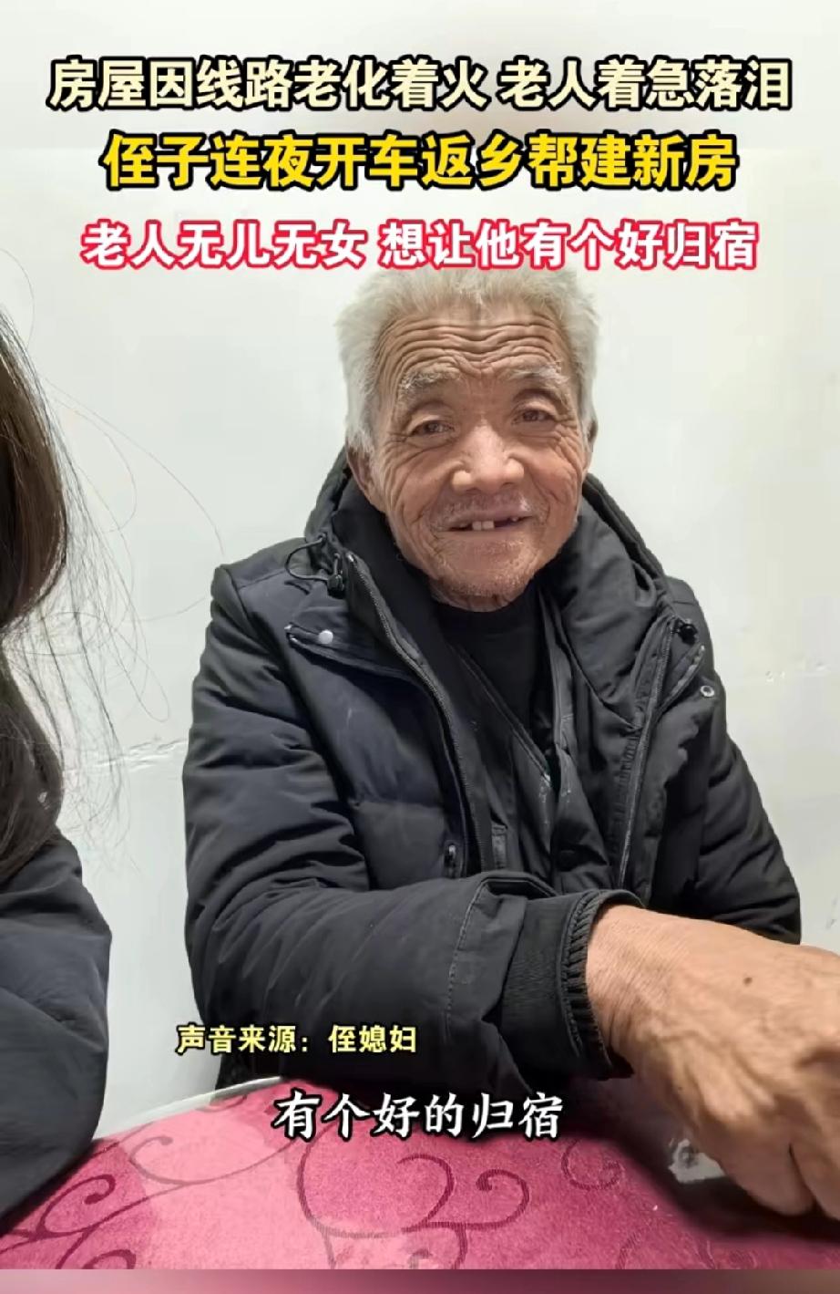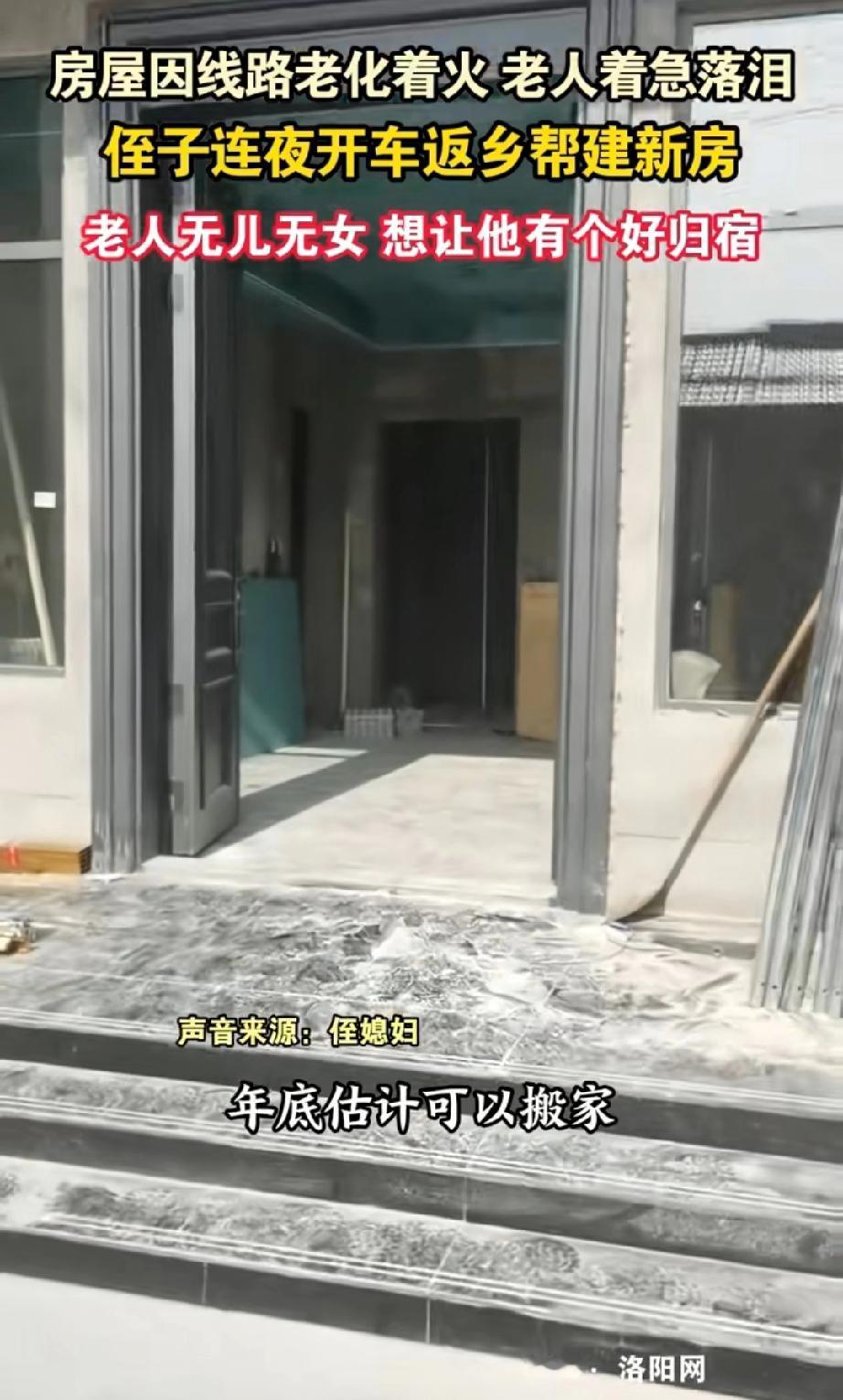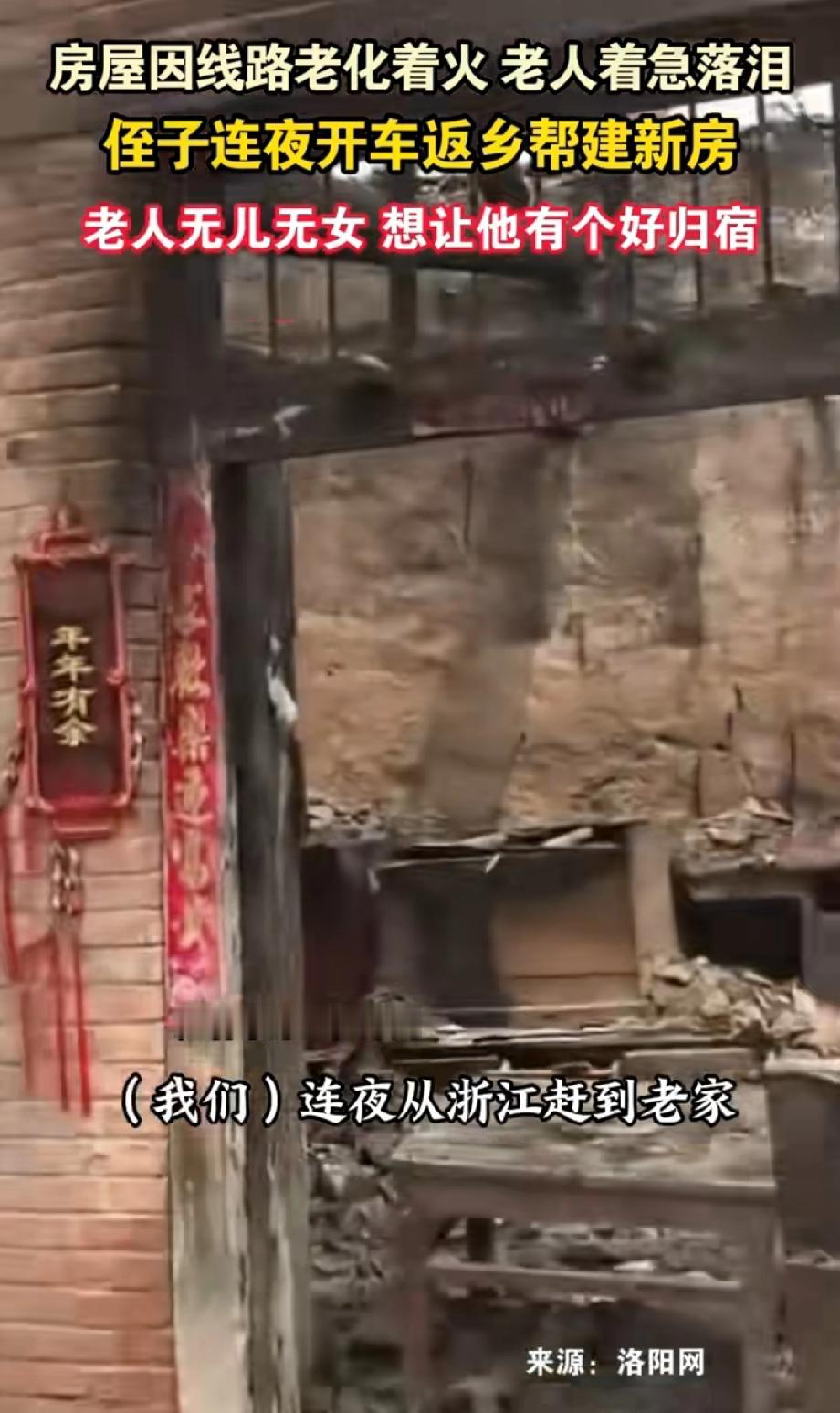 河南周口,70岁叔叔的房屋因电路老化燃起了熊熊大火。侄子和侄媳妇得知消息后,连夜从外省驱车赶回老家。 叔叔一夜未眠,坐在那儿,望着烧成废墟的老房子,默默流泪。 侄子走到叔叔跟前,安慰道:“烧了就烧了,这是老天爷想让您住新房子呢。” 叔叔见侄子来了,赶忙擦去脸颊的泪水,喃喃说道:“我就只有三千块钱,还是起火时我从房子里抢出来的,电动车也被烧没了。” 话落,叔叔的眼泪又流了下来。他从兜里掏出三千块钱给侄子看,又说:“这点钱修房子都不够,还能盖新房子吗?” 侄子看着叔叔手里的钱,笑着说:“您不是还有我嘛。这钱您留着,先别着急,去我家住,我这就找建筑工人给您盖房子。” 侄媳妇赶忙笑着补充道:“侄子就跟儿子一样,让您侄子出钱给您盖房子,再给您买辆新电动车,您就放宽心吧。” 其实,夫妻二人在回来的路上就已商量好给叔叔盖新房的事了。 叔叔一辈子未婚,膝下无子,却对侄子关爱备至。 侄子小时候,叔叔但凡有好吃的、好玩的,都会第一时间给侄子送去。 火灾发生在今年五月,如今新房已然建成,是一栋亮堂的三层小楼,连台阶都是用大理石铺就的。只需完成内部装修,叔叔就能搬入新家了。 叔叔每天都会到工地去,看着新房一点点建成,心中满是欣慰。 邻居们见到他,总会说一句:“您真是好福气啊。” 每次听到这话,叔叔那布满皱纹的脸上,都会绽放出骄傲的笑容。 村里人称赞侄子重情重义,侄子说:“我有能力了,就想让叔叔安享幸福晚年。” 也许是好人有好报,也许是血脉亲情的力量。但这是最美的结果。 孝道如此,善良如此,福德亦如此。总能让人瞬间被温暖包围,心生感动。 来源:洛阳网