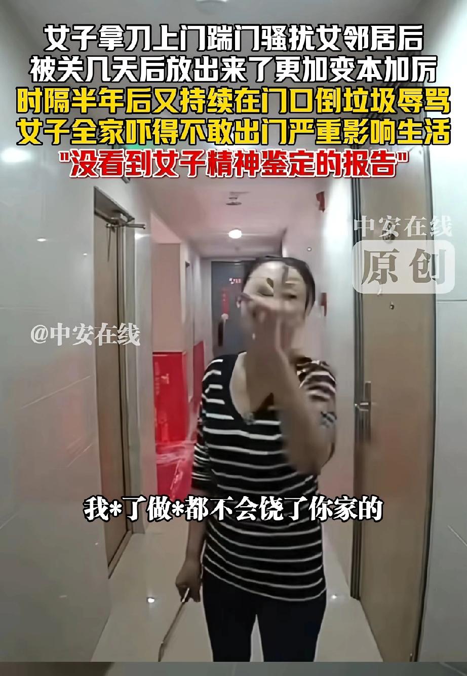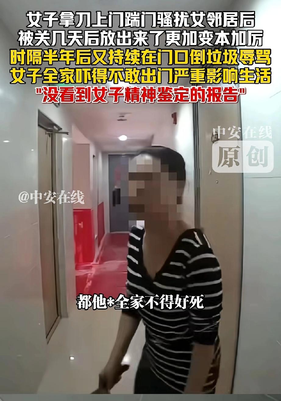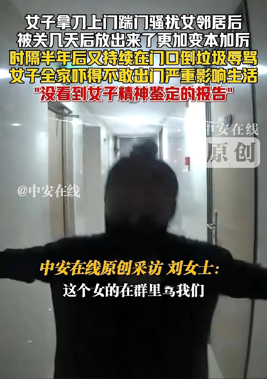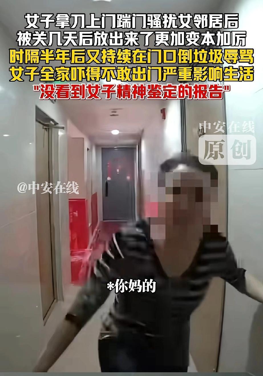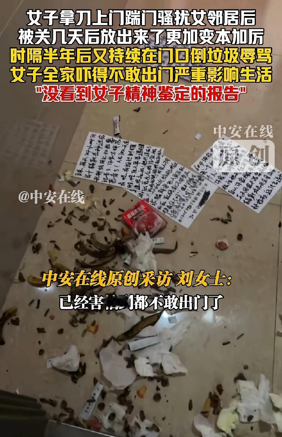 楼下有位女子,多次拎着菜刀冲到楼上邻居家,一边砍门一边辱骂,甚至把自家垃圾撒在邻