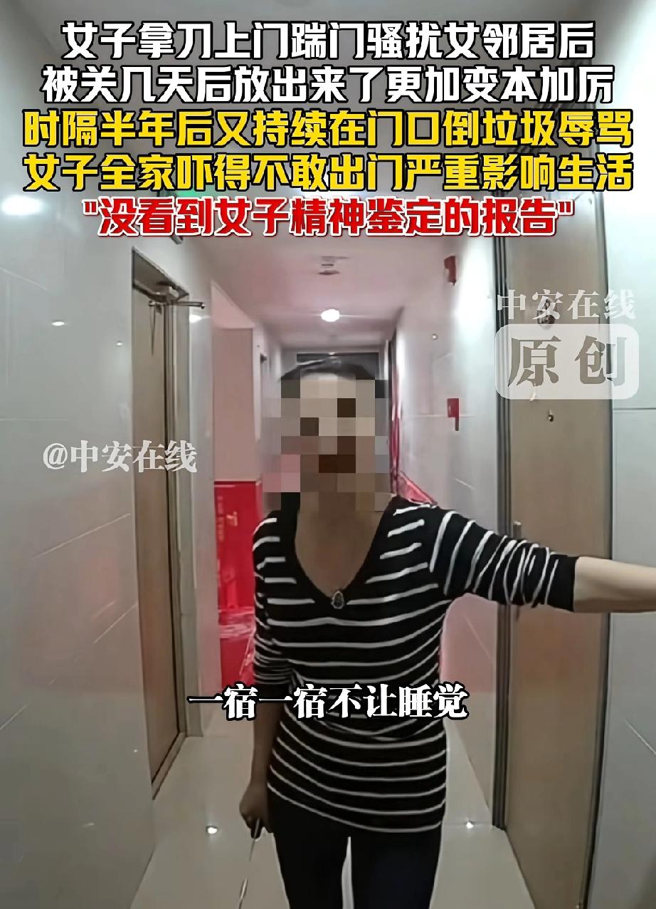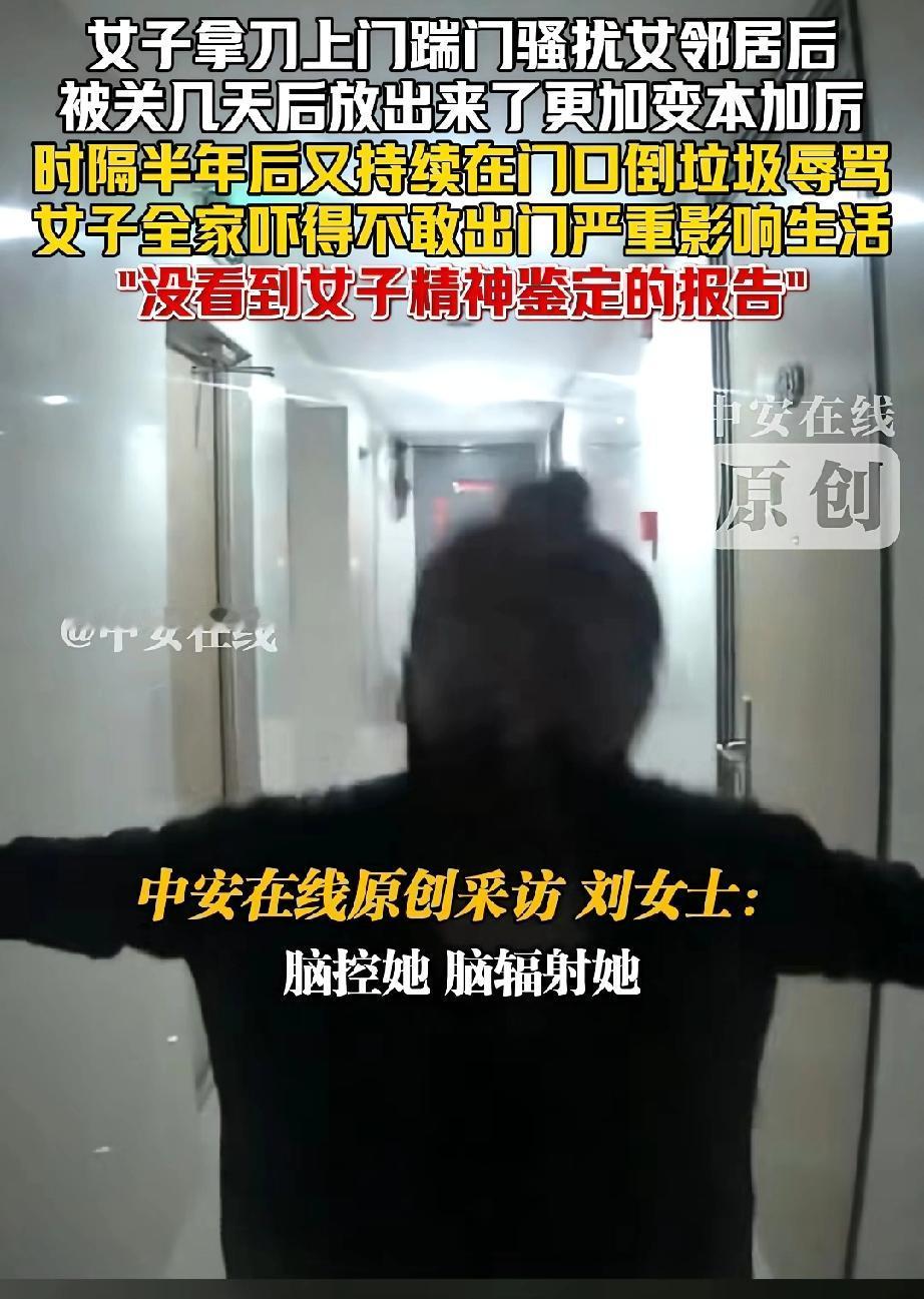 楼下有位女子,多次拎着菜刀冲到楼上邻居家,一边砍门一边辱骂,甚至把自家垃圾撒在邻居家门口。她这么做并非因为楼上有噪音,而是她觉得楼上邻居对她进行脑控或脑辐射,害得她整夜无法入眠。 这位楼下邻居买的是二手房。据其他邻居透露,在她买房之前,该女子就如此对待上一任业主,这才导致上一任业主卖房搬走。 邻居报过警,警察对女子进行了批评教育并实施拘留措施。然而,女子被放出后,依旧对邻居进行辱骂、威胁,还泼洒垃圾,让警察和邻居都无可奈何。 她甚至威胁邻居:“我会让你一家‘不 得 好 死’。”就凭这句话,邻居完全可以再次报警,女子会再次被派出所拘留。 邻居家的门已伤痕累累。可谁能做到对他人进行脑控呢?如今高科技“人脑联机”也没发展到这种程度。 这一切不过是女子的异想天开。或许她身体有其他疾病,导致耳朵一直能听到噪音,临床上有这样的病例。 有网友质疑女子患有精神病,但至今未见相关诊断报告。 邻居一家起初不敢出门,如今已搬出去租房居住。但女子仍不罢休,继续上门骚扰辱骂,其所有行为都被监控记录下来。 与这样的人做邻居,无异于在身边安放了一颗炸弹。让人整天提心吊胆,日子没法过。 对待此类人,需有更有效的处理办法。或是有关部门对她强制进行精神病鉴定,或是进行身体检查,确认病因,对症治疗。 来源:中安在线