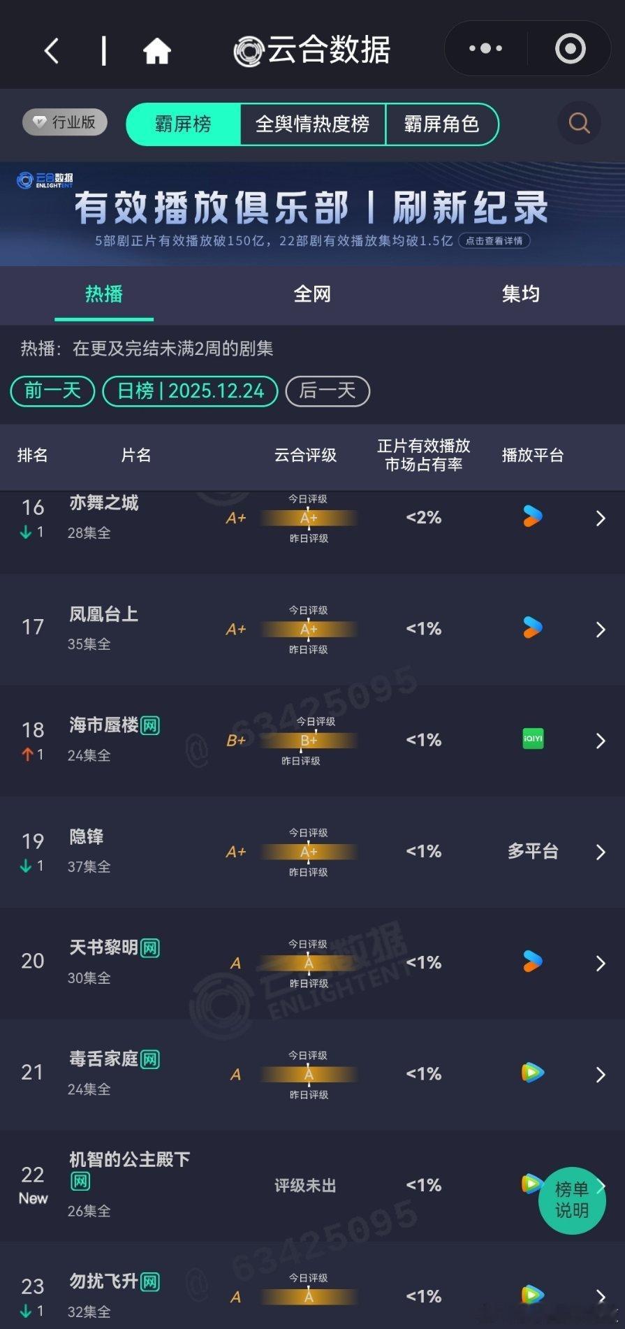 12月24日云合播放占比云合 老舅25.9%评级又降了一点长安二十四计12.1%也横得很稳定骄阳似我11.9%很不妙,第三天就有横盘趋势,评级堪忧。风与潮9.1%涨了点,好兆头。