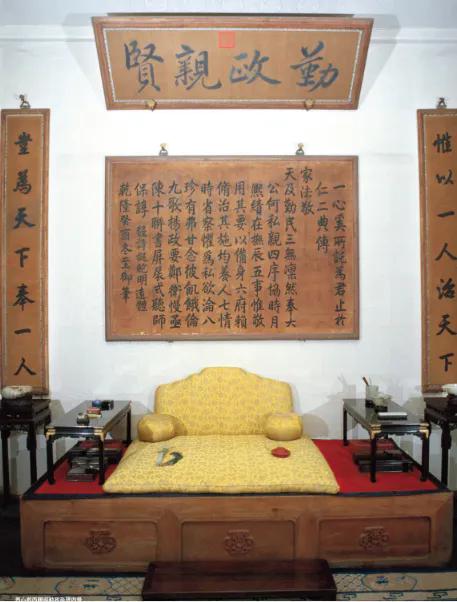 皇帝的宝座设在明间正中,上悬雍正御笔“中正仁和”匾。明间东侧的“东暖阁”内设宝座,向西,这里曾经是慈禧、慈安两太后垂帘听政处。