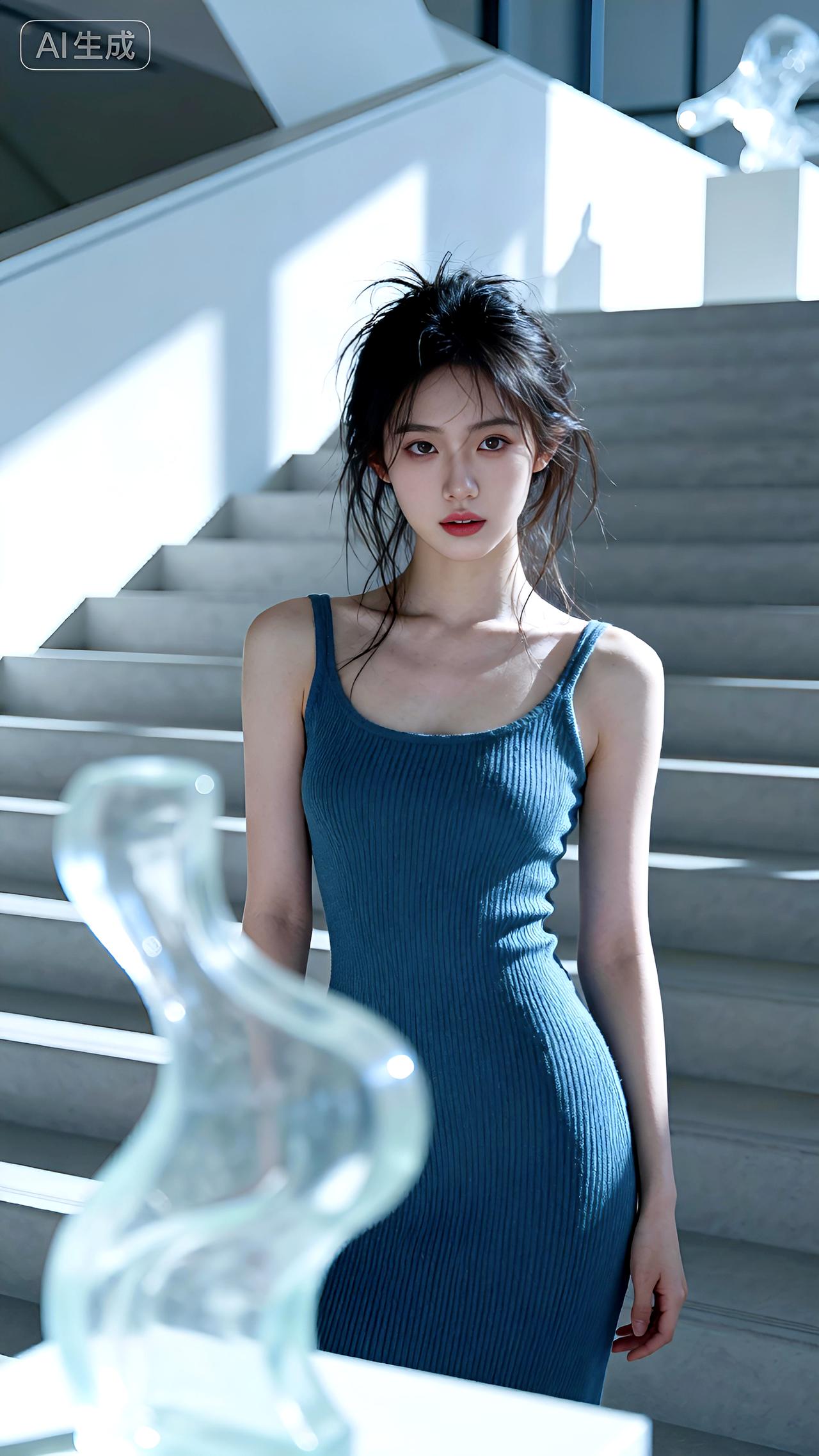 艺术馆阶梯间,一袭蓝裙,冷艳慵懒。光影刻画身影,故事藏于静谧,高级而疏离。 壁纸 写真