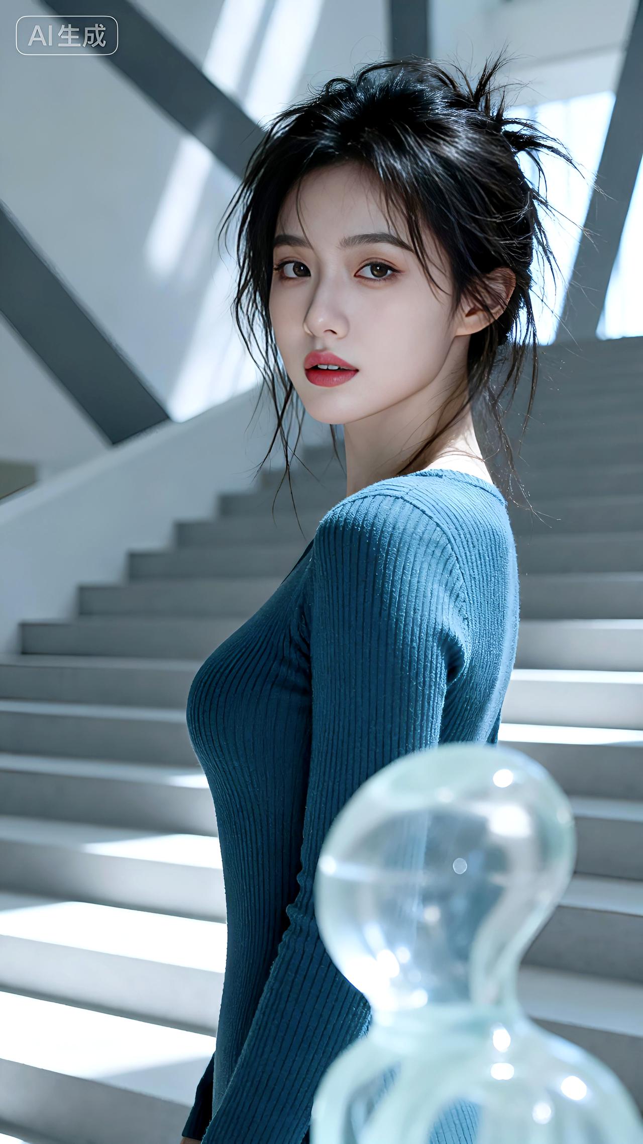 艺术馆阶梯间,一袭蓝裙,冷艳慵懒。光影刻画身影,故事藏于静谧,高级而疏离。 壁纸