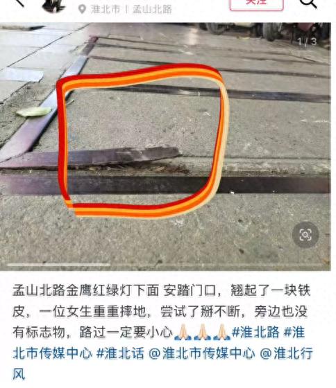 大皖新闻讯12月24日,淮北一网民在社交媒体发文称淮北市孟山北路人行道上有一块铁皮翘起,他还看到有一名路人被铁皮绊倒。
