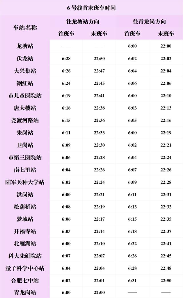 为了匹配大家的出行需求,6号线起始站工作日首班车为6:00,末班车为22:00,覆盖早高峰通勤和晚归出行。