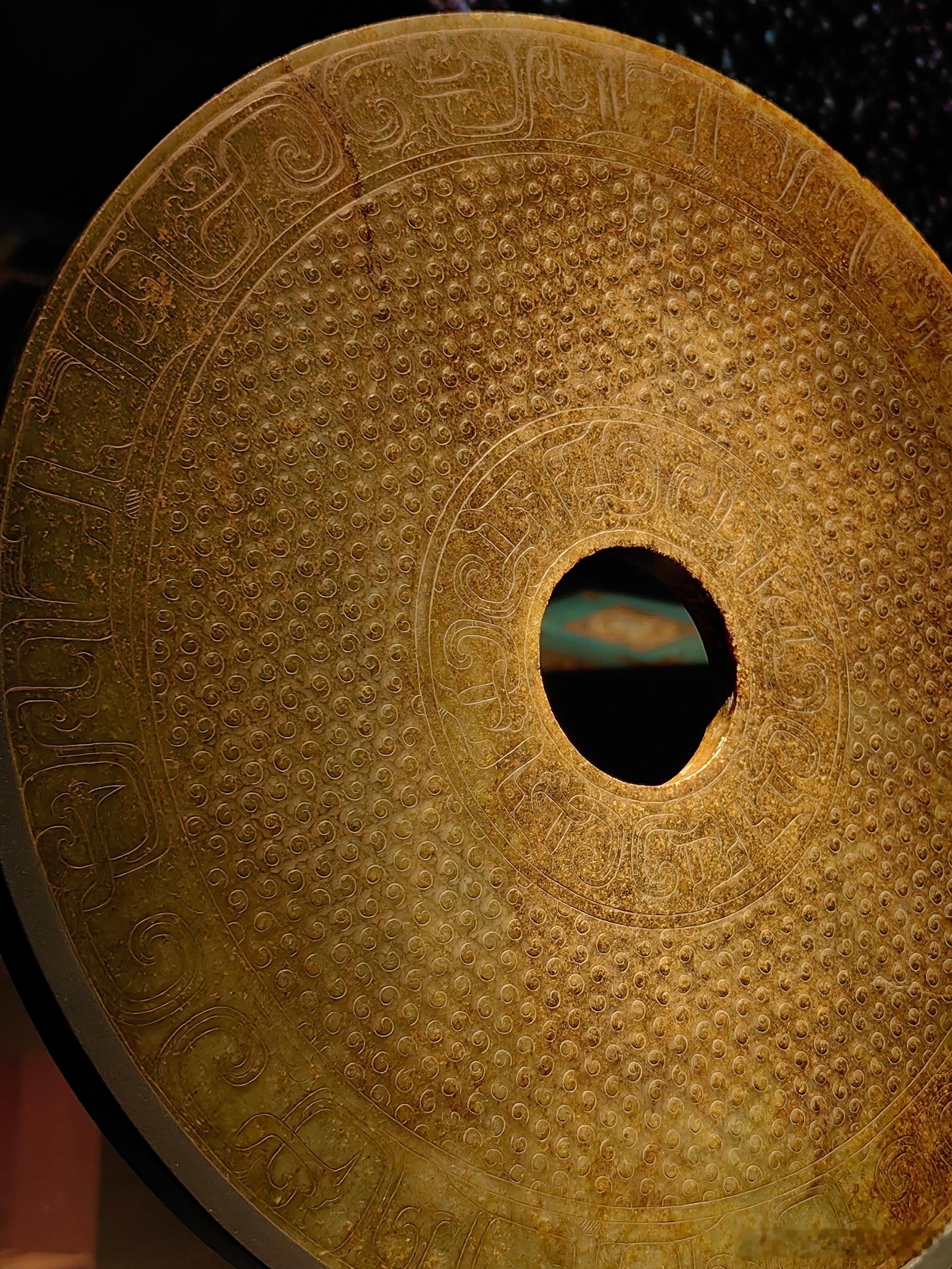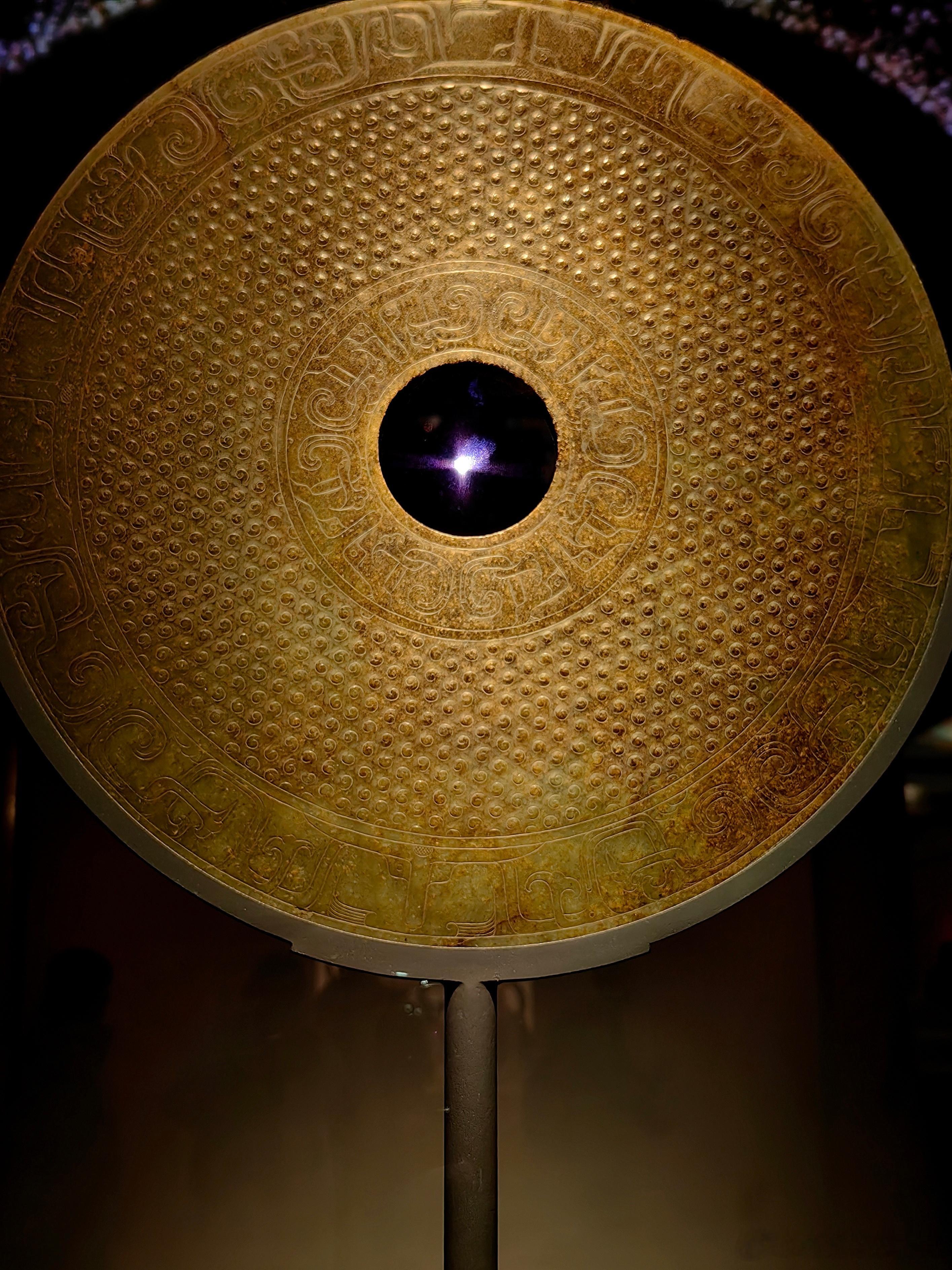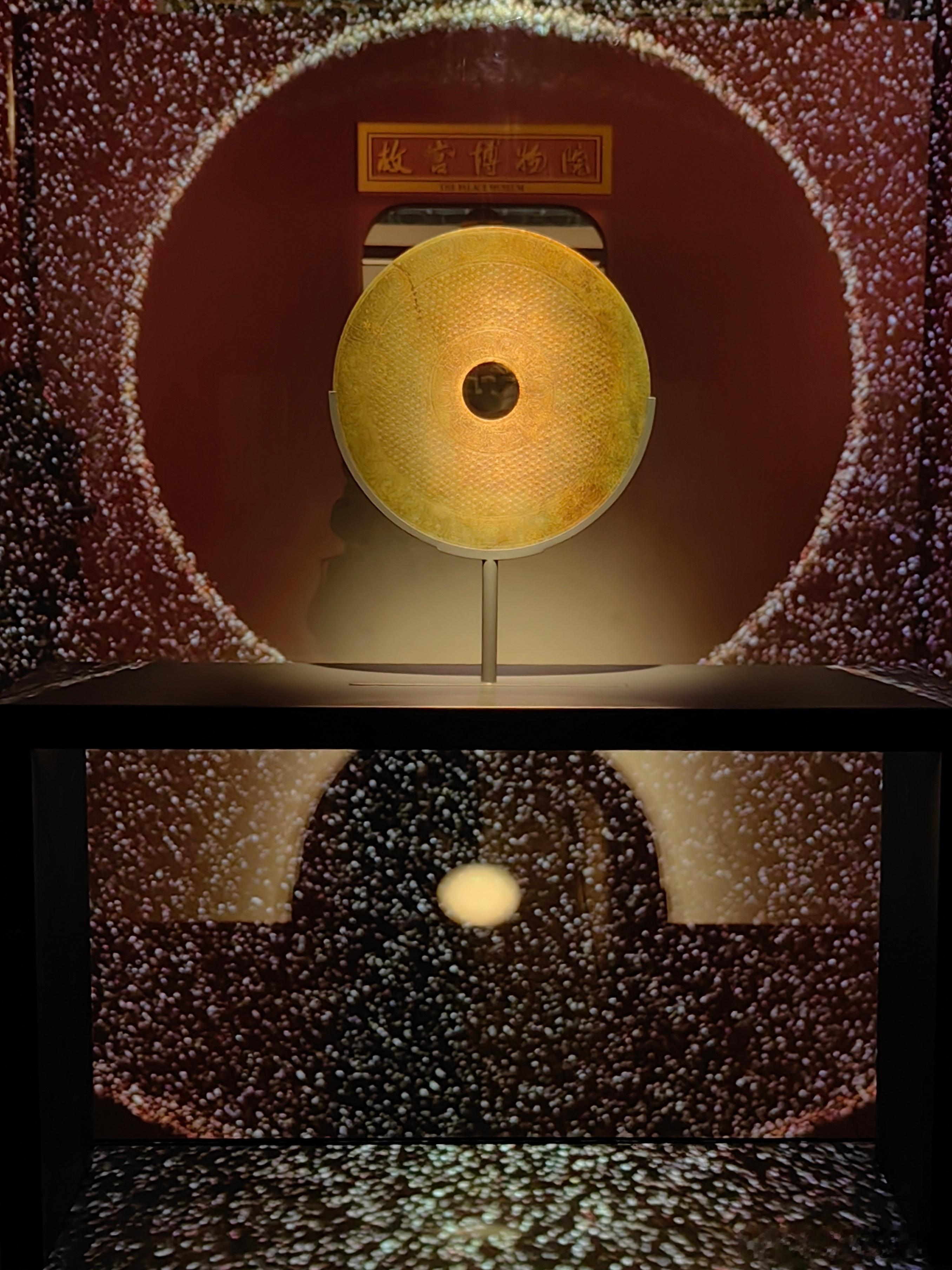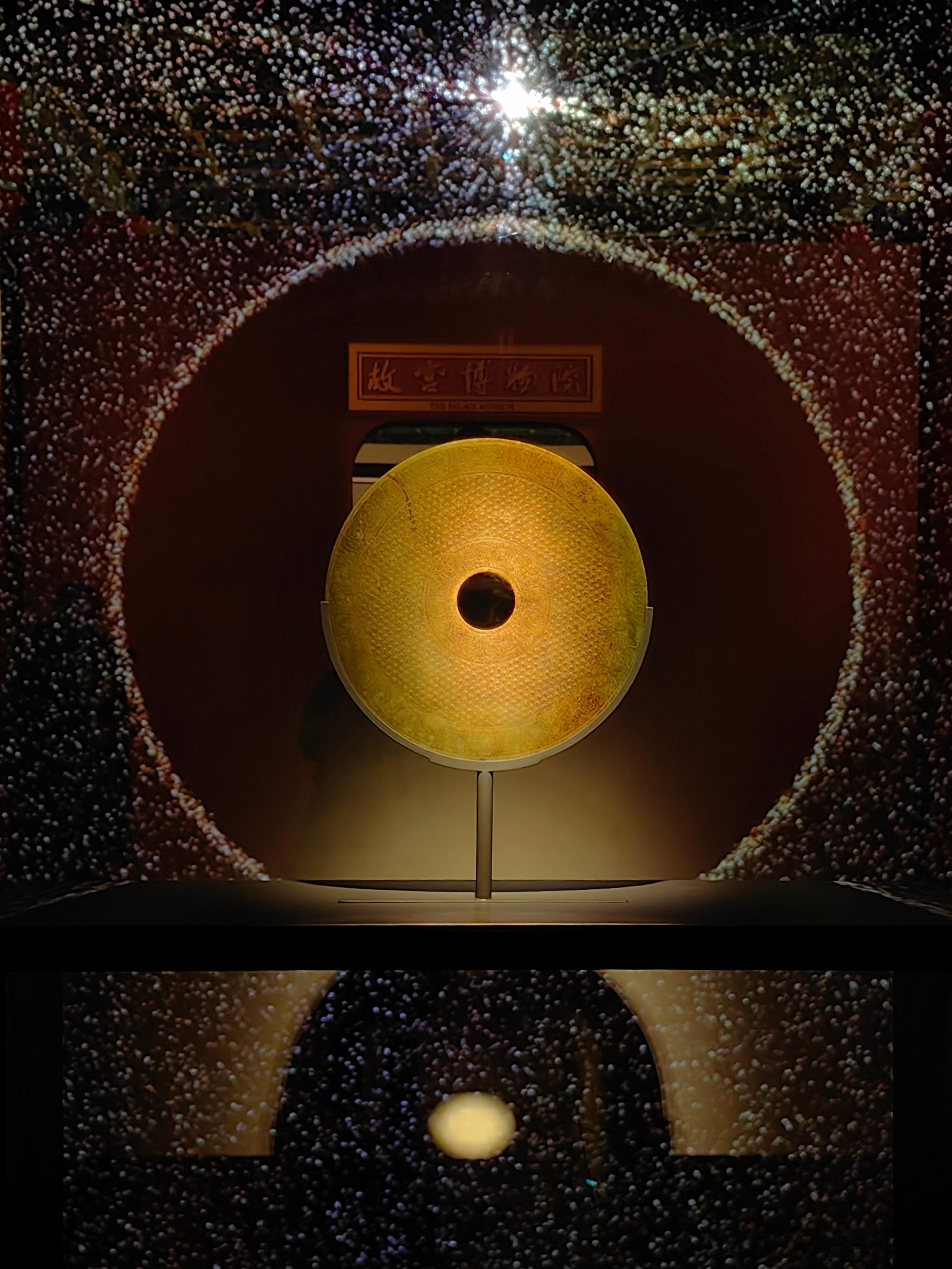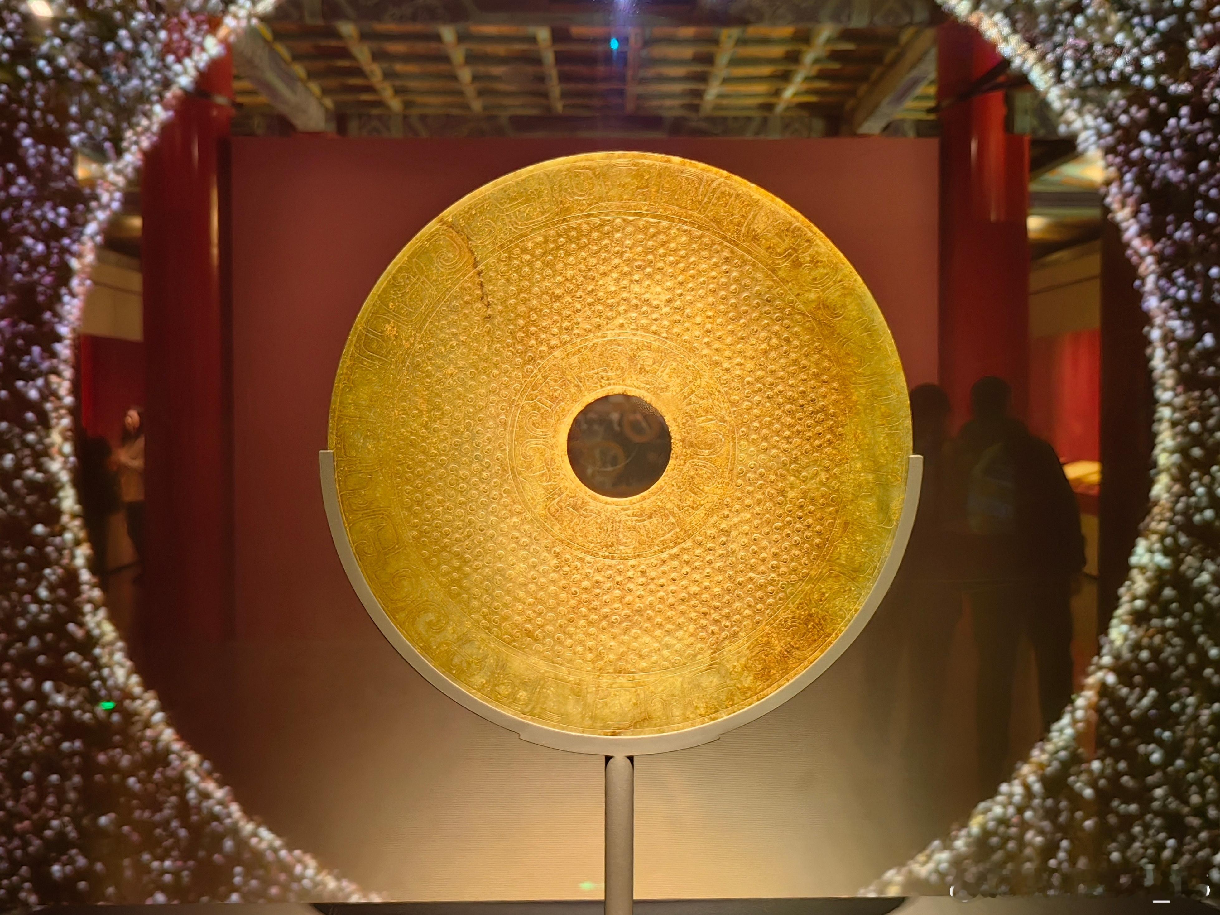 青玉兽面纹璧战国晚期至西汉早期故宫博物院藏玉色青绿,带大面积黄色沁斑,直径近40厘米,是已知汉代玉璧中最大的品类之一。纹饰以三道弦纹分隔为三区:内、外区为四组交错的夔龙纹,中区满饰卧蚕纹(谷纹),两面纹饰一致。玉璧外圈阴刻乾隆御制古篆诗,还被乾隆配置紫檀木架作为宫廷陈设,成为融合战国工艺与清代皇家文化的珍品。百年守护-从紫禁城到故宫博物院 展出