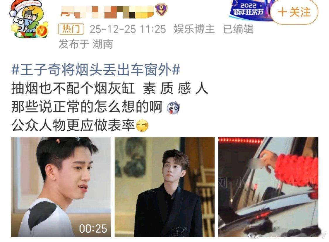 王子奇将烟头丢出车窗外王子奇刚道歉了,但网友好像不太买单,觉得乱丢烟头太不礼貌,为什么爱抽烟的明星都姓王!