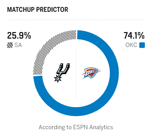 ESPN预测明日圣诞大战:雷霆胜率74.1%,马刺胜率25.9%