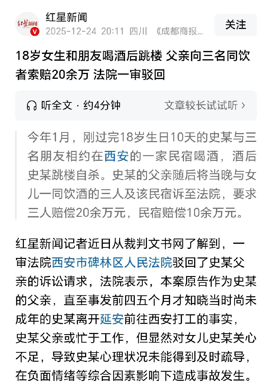 有枣没枣打一竿子!陕西西安,女子刚过完18岁生日,就和三个朋友去民宿喝酒,酒后不慎坠楼身亡。女孩的继父把三个同饮者告上法庭,以没有尽到救助义务,索要20万赔偿。不仅如此,他还把民宿告上法庭,以没有尽到安全保障义务为由,索要10余万元赔偿。法院审理发现,女儿未成年就外出打工,继父竟然后知后觉,他对女儿关心不足,这才造成事故的发生。 2025年1月,刚过完18岁生日没几天的史某,在西安一家民宿里喝完酒,竟然从楼上跳了下去。 等第二天早上8点多被发现时,人已经没了。 得知女儿离世的消息,史某的父亲史先生悲痛欲绝,他把这一切都归咎于一起喝酒的朋友和民宿。 史某是史先生的非婚生女,出事的时候刚满18岁10天,按理说正是青春正好的年纪,怎么会走到这一步? 原来,史某早就没上学了,还没成年的时候就从老家延安跑到西安打工,史先生对此竟然一直不知情,直到案发前四五个月才知道女儿打工的事实。 据一起喝酒的朋友李某介绍,那天是史某主动给他发消息,说自己心情不好,想让他陪着喝酒。 他们四个人在民宿里喝酒的时候,也没发生啥冲突,一直很顺利。 中途李某想走,史某还一直挽留,说她心情不好,希望朋友们能多陪陪她,李某见状也就没好意思硬走。 可他万万没想到,李某他们离开后没多久,就传来了史某坠楼的消息。 李某觉得特别愧疚,要是知道史某有跳楼的念头,他说什么也不会离开。 和李某一起喝酒的吕某、陈某,也和李某持同样的态度,他们都坚持认为,自己没劝史某喝酒,也不知道她会想不开。 意外突然来临,史某的父亲不管三七二十一,直接把三个朋友告上法庭,还把民宿经营者也一并告上法庭。 民宿经营者觉得挺无辜,公安局早就出具了意见,史某是自杀身亡的。 民宿老板表示,史某已经是完全民事行为能力人,该对自己的行为负责。 而且事发的窗户在厨房,得先爬上橱柜台面才能到窗台,民宿的房屋结构、栏杆高度都符合居住标准,也没有规定说民宿必须装护栏,他们已经尽到安全保障义务了。 至于史某是用朋友身份登记入住,民宿没仔细核对信息,这确实是个问题,但这该由行政机关处罚,和史某自杀没有法律上的关系,总不能把人自杀的责任算到他们头上。 史先生这边却不这么想。他觉得,三个朋友既然和女儿一起喝酒,就该照顾好她,眼睁睁看着她出事,肯定要担责。 民宿没看好人,也得赔钱。史先生算了一笔账,向三个朋友索赔207980.9元,向民宿索赔103990.45元,加起来三十多万。 一、史某作为完全民事行为能力人,应当对自身行为后果负责。 《民法典》明确规定:十八周岁以上的公民是成年人,具有完全民事行为能力,可以独立进行民事活动,是完全民事行为能力人。 史某事发时已年满18周岁10天,其对自身行为的性质、后果具备独立判断和预见能力,史某应当明知跳楼会导致死亡结果的发生。 二、共同饮酒人安全注意义务不是索赔依据。 《民法典》第一千一百六十五条规定:行为人因过错侵害他人民事权益造成损害的,应当承担侵权责任。 案例中,现有证据无法证明李某、吕某、陈某存在强迫劝酒、明知史某不能饮酒仍劝酒等过错行为,且史某饮酒后并未处于醉酒失控状态。 李某等人离开时,史某仍能正常表达挽留意愿,无证据显示其当时已丧失自我控制能力。 从因果关系来看,史某的自杀行为是其主观意志主导的独立行为,与共同饮酒行为之间不存在法律上的直接因果关系。 反观案件事实,饮酒系史某主动召集,其因自身负面情绪引发极端行为,责任主体应是其本人。 三、民宿经营者安全保障义务也是有限责任。 《民法典》第一千一百九十八条规定:宾馆等经营场所、公共场所的经营者、管理者,未尽到安全保障义务,造成他人损害的,应当承担侵权责任。 本案中,事发窗户位于厨房,需攀爬橱柜台面才能到达窗台,该结构设计符合普通居住场所的安全标准,且无法律法规强制要求民宿对此类窗户加装护栏。 从风险可预见性来看,民宿经营者无法预见入住者会主动实施跳楼自杀行为,此类极端风险不属于经营场所应防范的“合理风险”。 安全保障义务旨在防范“可预见的、因场所管理缺陷导致的损害”,而非对入住者的所有行为后果承担兜底责任,过度苛责经营者将违背公平原则,也不利于行业正常发展。 反而史先生作为父亲,即便可能是忙于工作,但对女儿的关心确实不够,孩子的心理状况没人及时疏导,负面情绪攒多了,才最终酿成悲剧。 最终,法院驳回了史先生的全部诉讼请求。