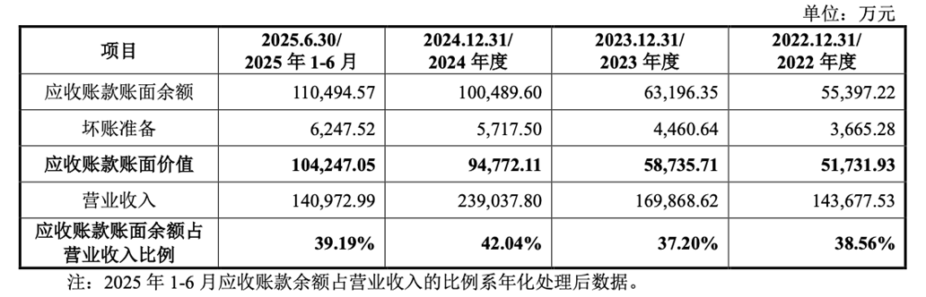 反映在资产端,2024年末公司应收账款余额达到9.48亿元,占总收入的比例高达42.04%,且应收账款增速(61.35%)远超同期营收增速(40.72%)。应收账款周转率逐年走低,从2024年末的2.92次/年,降至2025年6月末的2.67次/年。