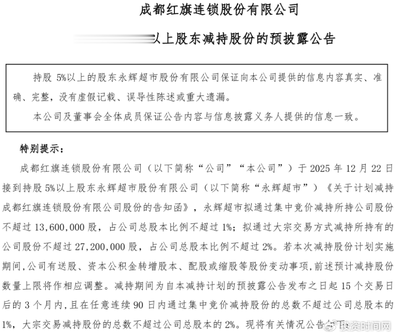 12月23日,红旗连锁(002697.SZ)发布股东减持预披露公告称,永辉超市(601933.SH)计划自公告发布之日起15个交易日后的3个月内,通过集中竞价方式减持不超过1360万股(占公司总股本的1%),通过大宗交易方式减持不超过2720万股(占公司总股本的2%)。